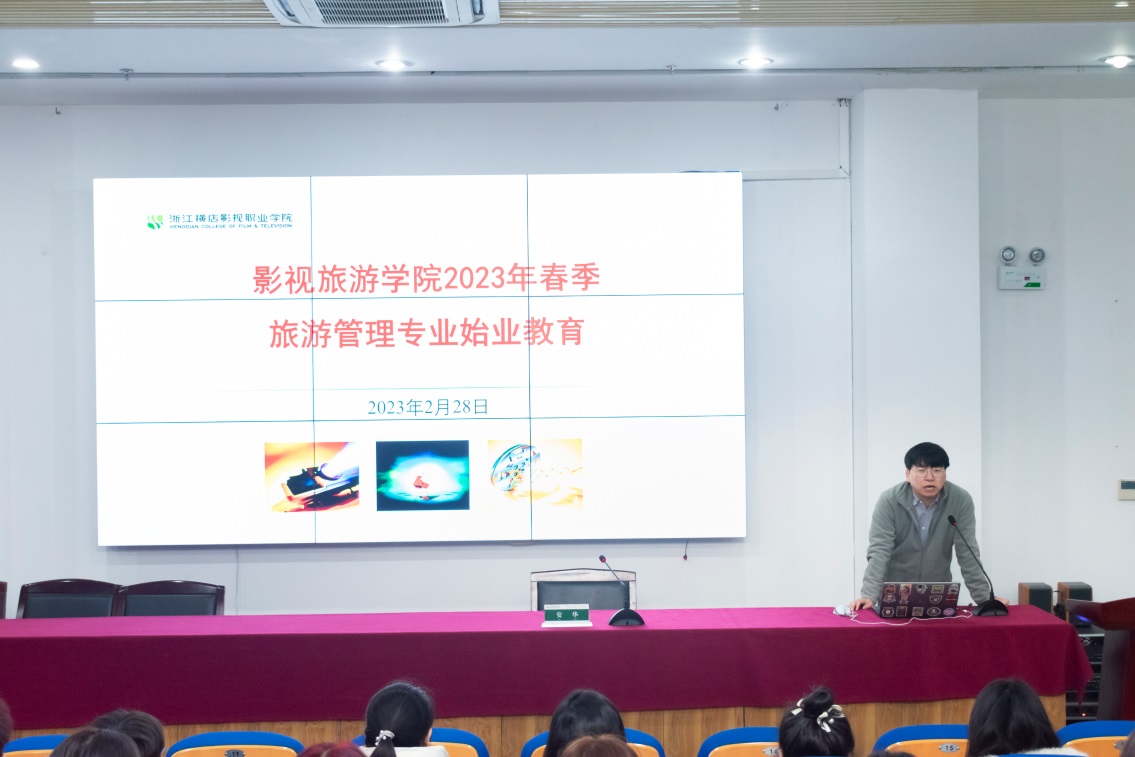 2023年2月28日,影视旅游学院2023级旅游管理专业春季新生开学第一课暨始业教育在图书馆报告厅举行,浙江横店影视职业学院党委副书记、常务副校长安华、影视旅游学院党总...