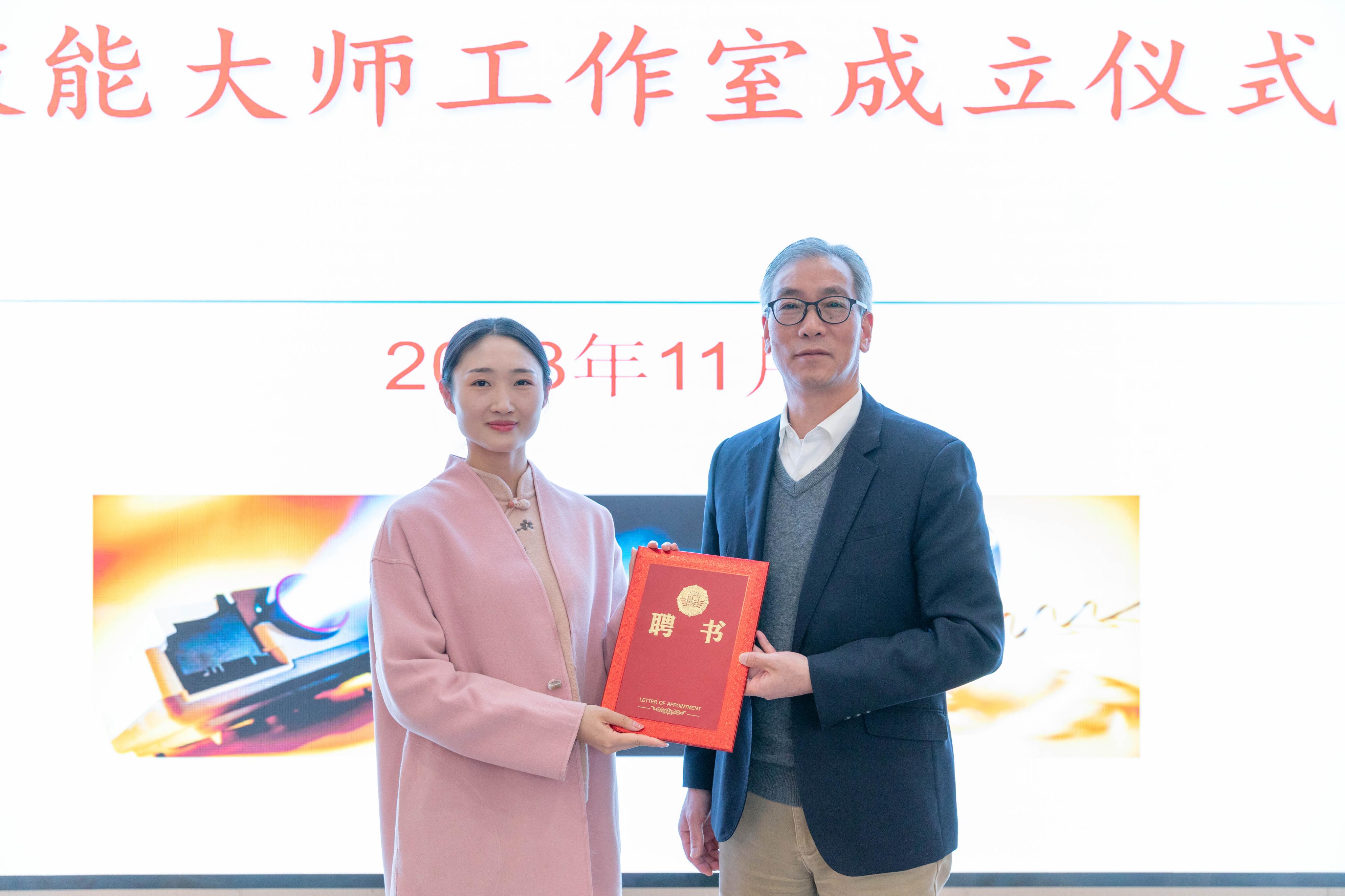 王兆青与吴玉梅共同为工作室揭牌。王兆青为吴玉梅颁发聘书,从这一刻起,吴玉梅女士正式成为我校技能大师工作室的主持人,也是我校的一名行业导师。