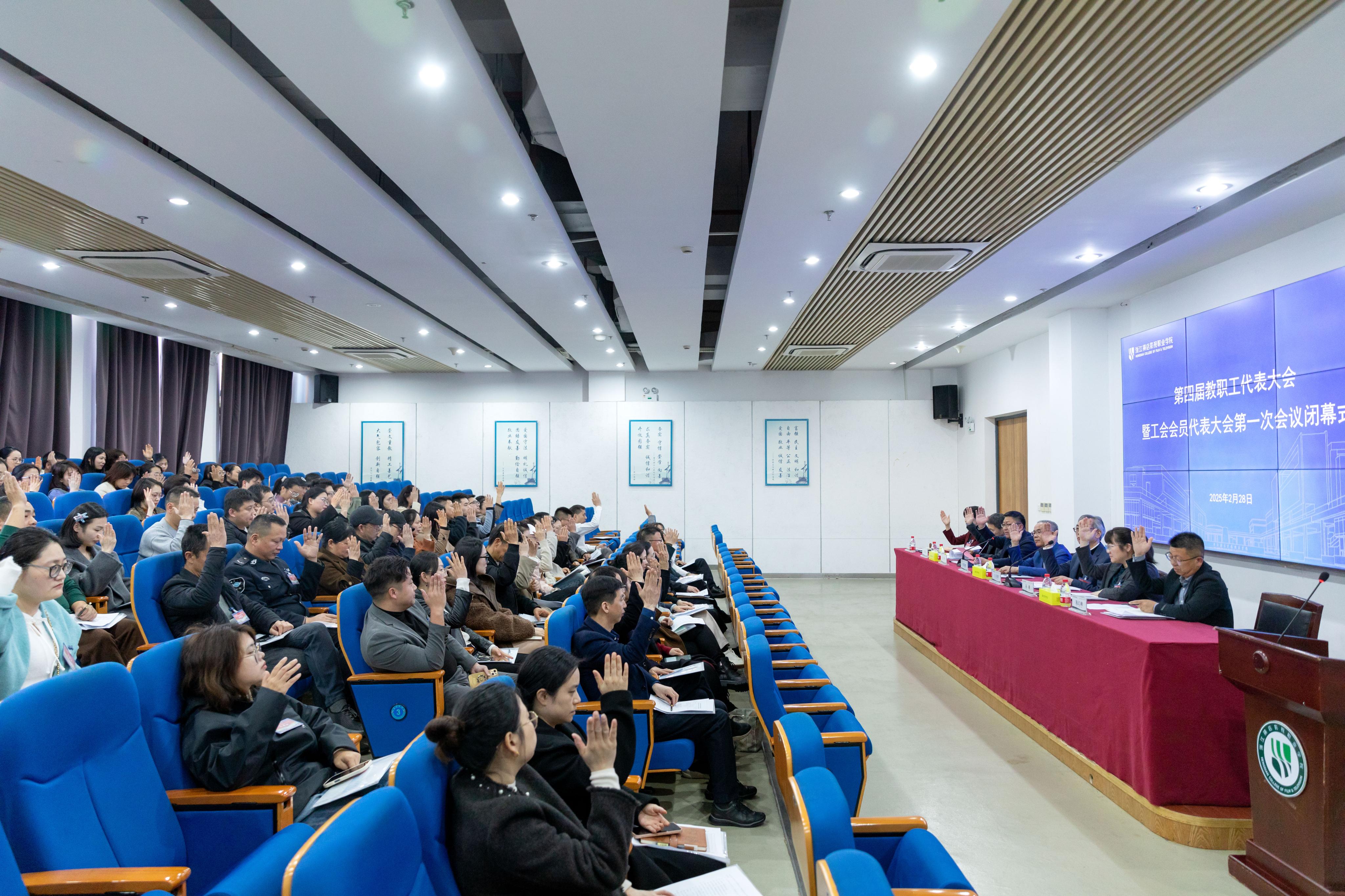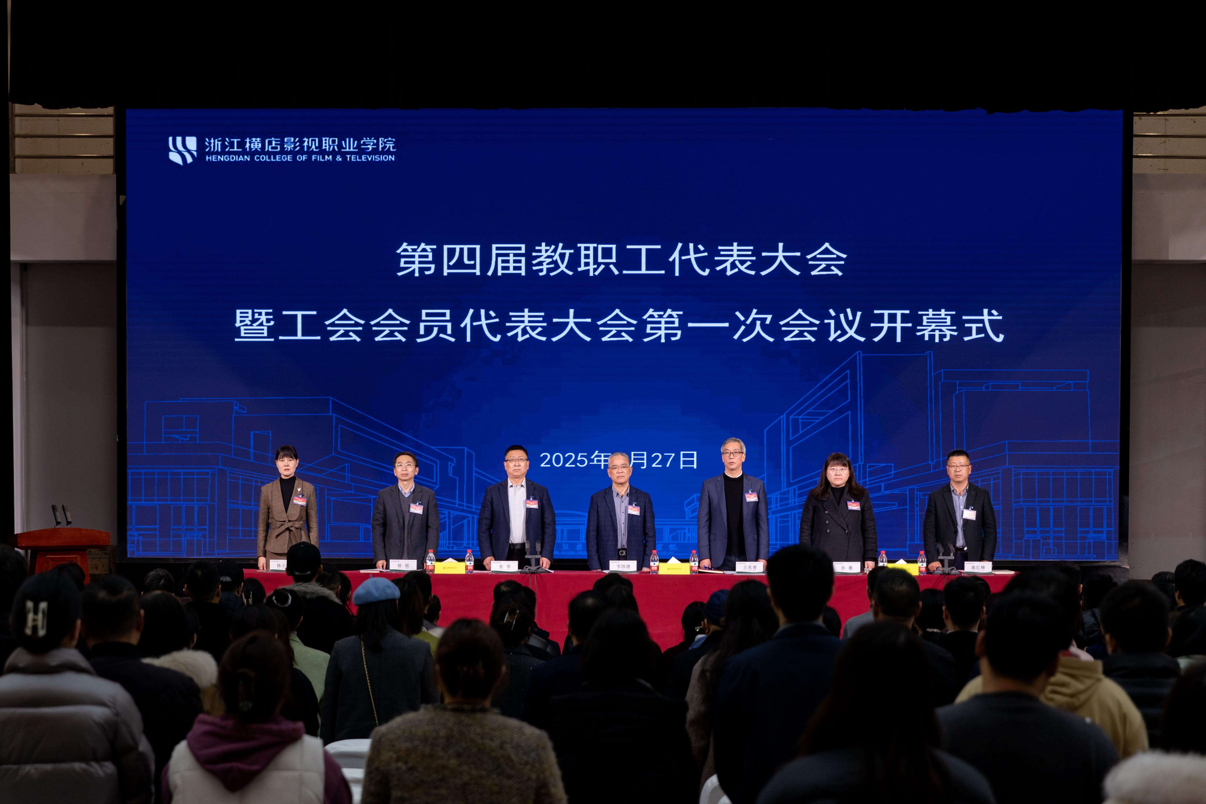 2月27日下午,浙江横店影视职业学院第四届教职工代表大会暨工会会员代表大会第一次会议在实验剧场隆重开幕。横店集团助理总裁、学校董事长韦国清,党委书记王兆青、校长安华等校领导班子成员出席会议,教职工代表与工会会员代表齐聚一堂,共商学校发展蓝图。