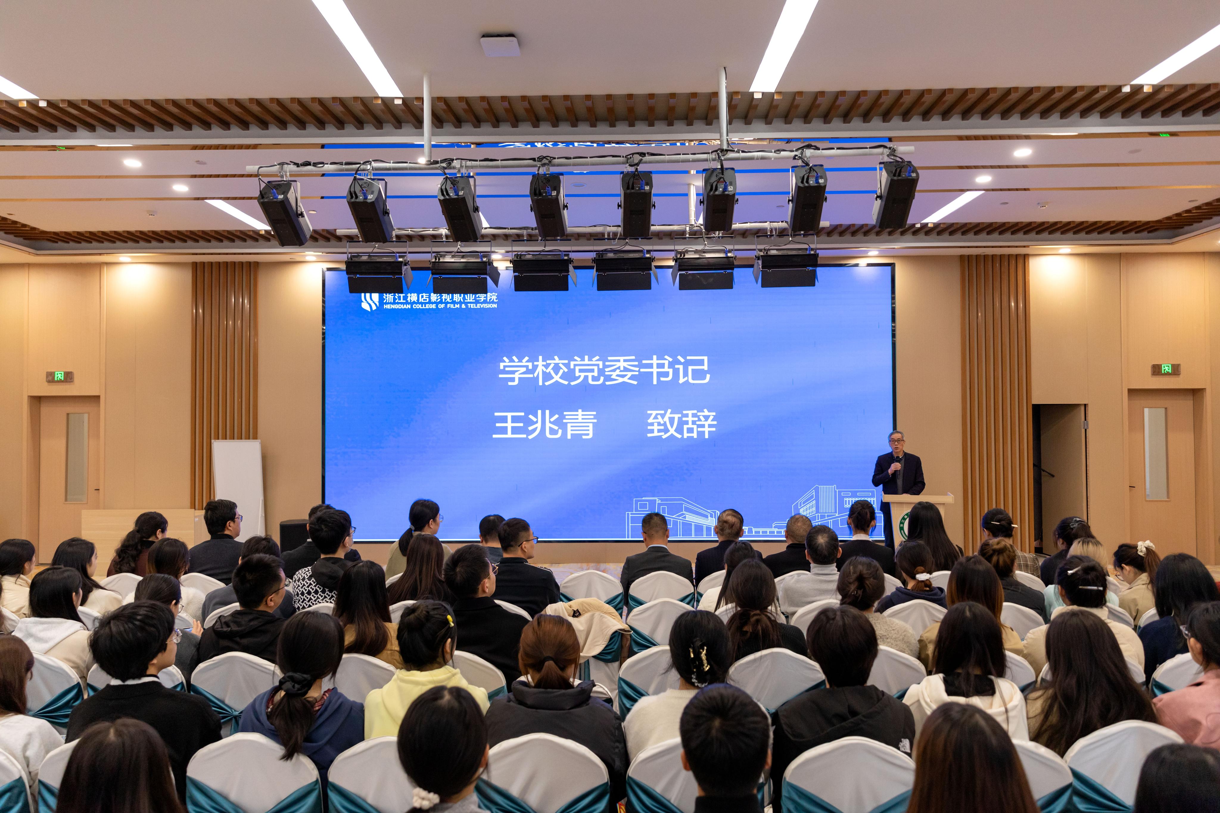王兆青在讲话中指出,思想建党、理论强党是我们党在长期发展过程中积累形成的宝贵历史经验和光荣传统,用党的创新理论武装全党是党的思想建设的根本任务。“星燎宣讲团”的成立,是学校加强思想政治工作、推动理论学习与实践相结合的重要举措。通过这支政治坚定、理论深厚、表达出色的师生宣讲队伍的宣讲活动,将党的最新理论成果、国家政策以及时事热点等核心内容,以更加生动、形象的方式传递给广大师生乃至社会各界。他对宣讲团今后的工作提出几点希望:要坚定政治立场;要深化理论学习;要创新宣讲形式;要建立健全长效机制,为推动学校思想政治工作和文化建设贡献自己的青春力量。施红峰宣读《关于成立浙江横店影视职业学院“星燎宣讲团”的通知》文件。王兆青为宣讲团授旗,随后“星燎宣讲团”团长章李婕做就职演讲。