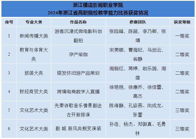 其中,影视制作学院张险峰、陈超、李乃卿、张靖团队荣获一等奖;影视旅游学院宋美娜、曹海妃、马剑云、翁静团队,影视旅游学院周晓红、蒋婷、赵乐园、周雄团队,影视经济学院徐艳艳、徐康乔、徐佳蕾、高杰团队,均荣获二等奖;影视表演学院陈海静、孔姿燕、向成龙、张蕾团队和影视美术学院孙浩、杨杰、郑御真、毛勇林团队双双荣获三等奖。 浙江省高职院校教学能力比赛由浙江省教育厅主办,是代表省内高职院校教学能力最高水平的权威赛事。本次比赛共收到来自48所高校358件参赛作品。经网络初评、现场决赛,共评出一等奖41项,二等奖71项,三等奖112项。