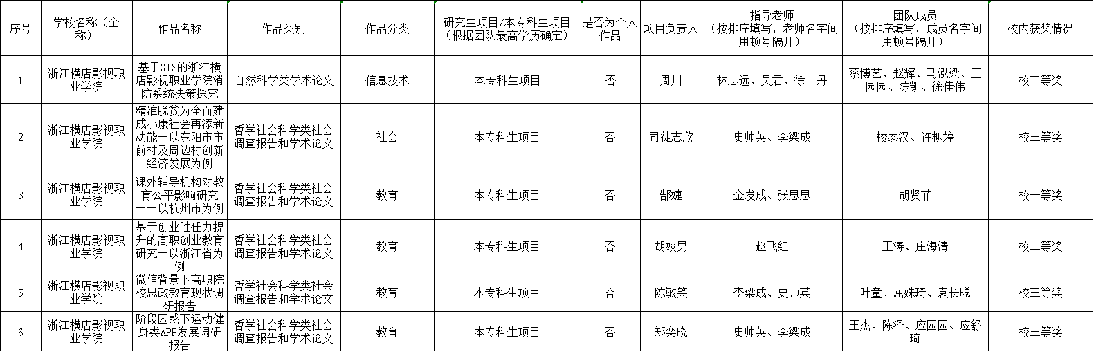 根据浙江省大学生创新创业大赛组委会《关于组织开展浙江省第十七届“挑战杯”大学生课外学术科技作品竞赛的预通知》要求,学校团委对校内申报作品进行了评审,拟推荐以下6件作品参加浙江省第十七届“挑战杯”大学生课外学术科技作品竞赛。现将作品信息予以公示,公示时间为2021年4月3日至2021年4月7日。如有问题,请在公示期内以邮件形式实名反馈给校团委1542962820@qq.com。