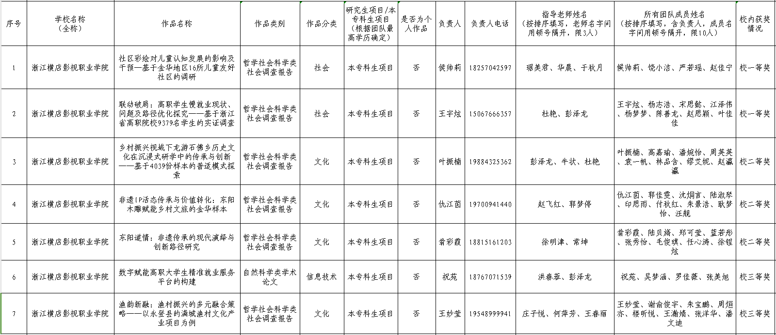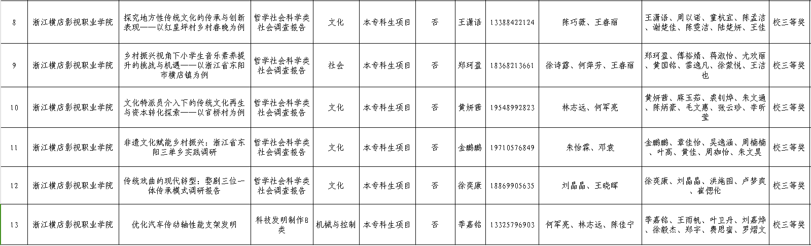 根据浙江省大学生创新创业大赛组委会《关于组织开展浙江省第十九届“挑战杯”大学生课外学术科技作品竞赛的预通知》要求,学校团委对校内申报作品进行了评审,拟推荐以下13件作品参加浙江省第十九届“挑战杯”大学生课外学生科技作品竞赛。现将作品信息予以公示,公示时间为2025年4月2日至2025年4月7日,如有问题,请在公示期内以邮件形式实名反馈给校团委735416192@qq.com。