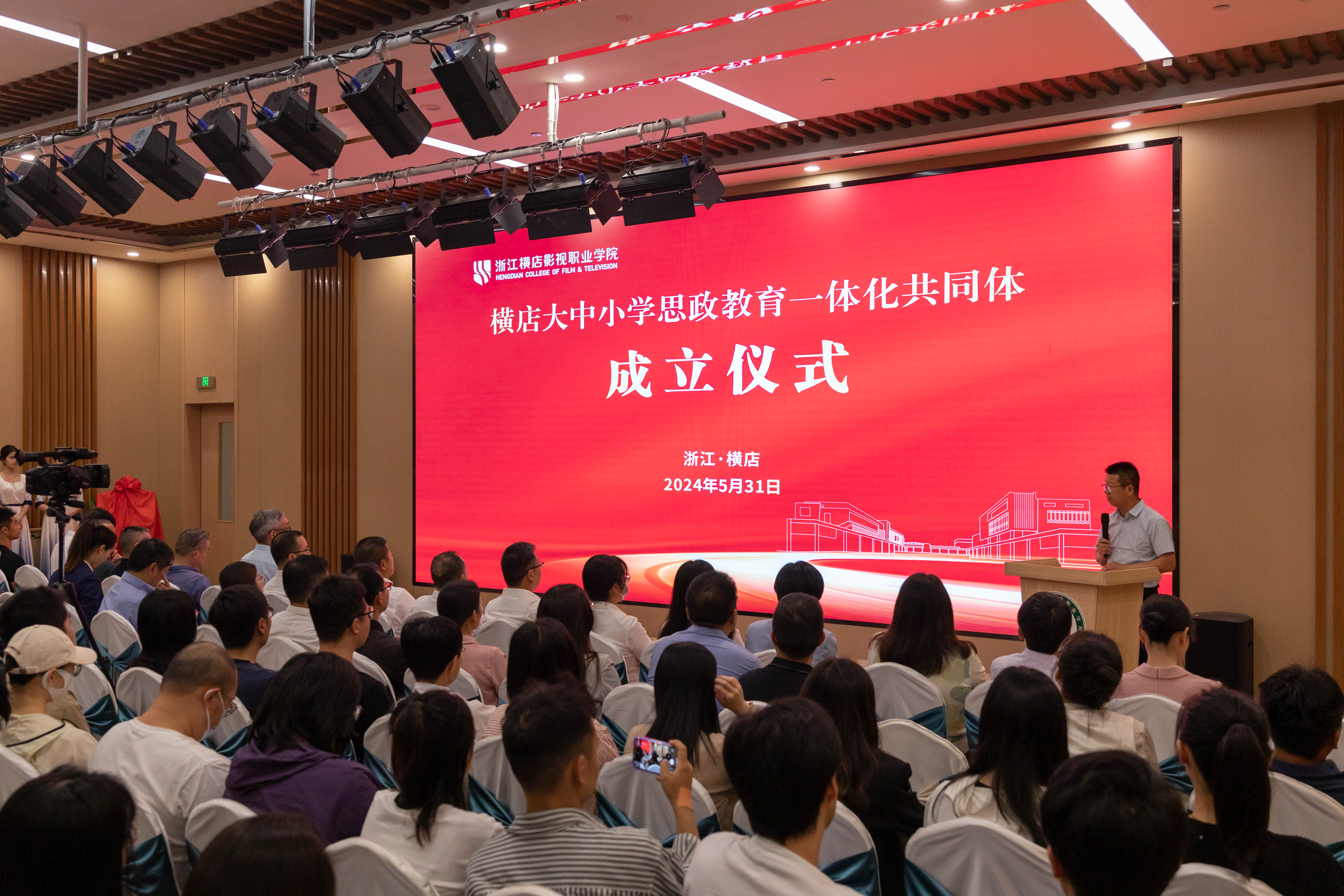 为深入学习习近平新时代中国特色社会主义思想和党的二十大精神,进一步推进大中小学思政教育一体化建设,5月31日,横店大中小学思政教育一体化共同体成立仪式在浙江横店影视职业学院举行。浙江理工大学红色文化研究院院长、马院原院长,教育部高校思政课教指委委员,中国红色文化研究会常务理事渠长根教授,东阳市人民法院党组成员、政治部主任马振强,东阳市横店镇人民政府人大副主席王永明,浙江横店影视职业学院党委书记王兆青、校长安华等领导出席会议,横店区域各学段学校负责人,思政教育教师,横店影视学院各部门负责人及师生代表参加会议。
