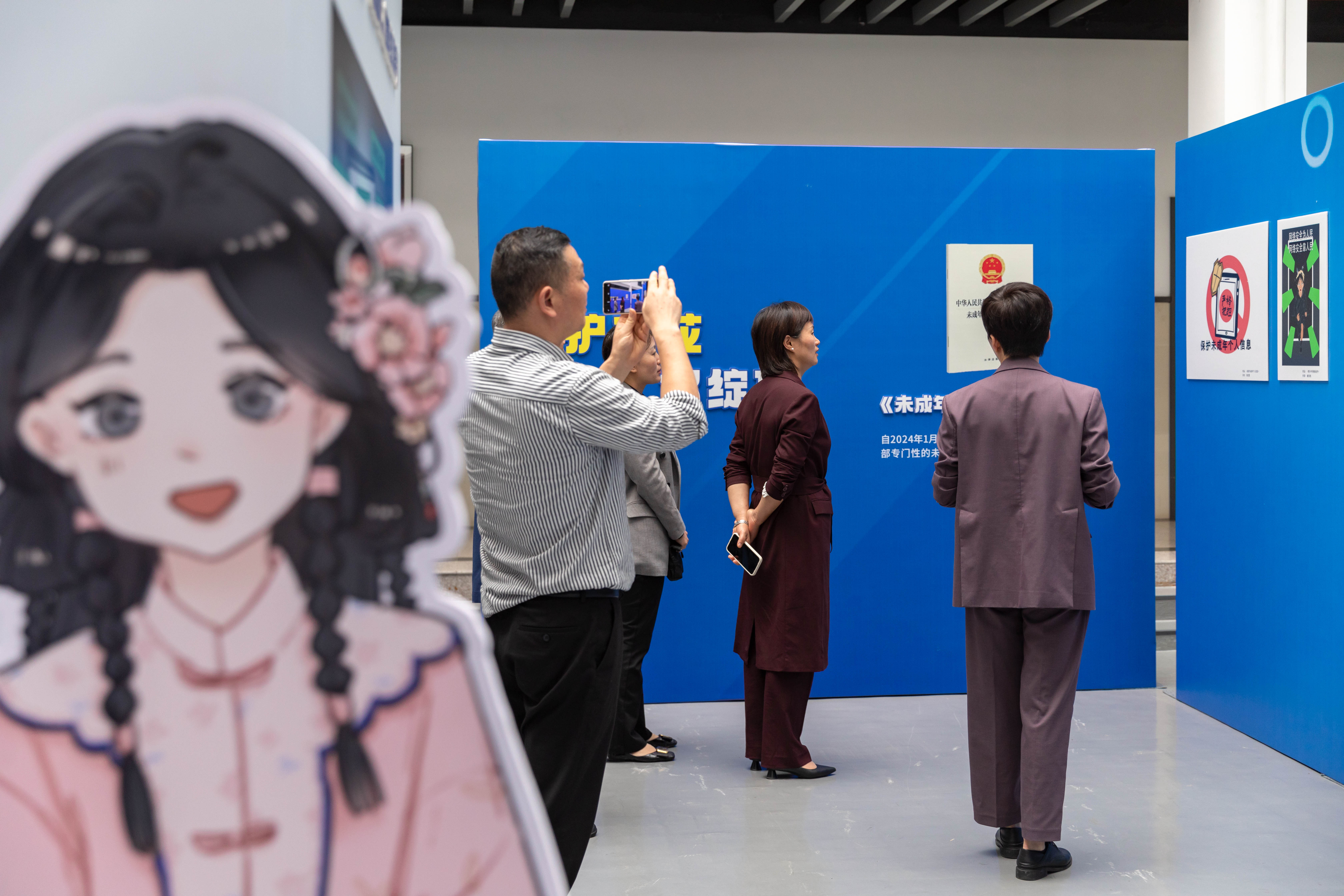 在横店集团助理总裁、浙江横店影视职业学院董事长韦国清,校长安华等校领导陪同下,吴婉珍一行参观了“弘扬时代新风 共建网络文明”主题网络普法作品展。