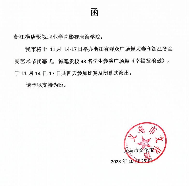 11月14-17日,我校唐璇、郝帅、任东阳、崔雪莹四位老师带队,携舞蹈表演专业、表演艺术专业48名学生参加浙江省群众广场舞大赛和浙江省全民艺术节闭幕式演出,此次活动圆满完成,得到各界的认可和肯定。本次活动中,我校师生的专业素养、专业能力及人文素养得到相关部门人员的认可及夸赞,本次活动的开展,也为以后的深入合作奠定了坚实基础。