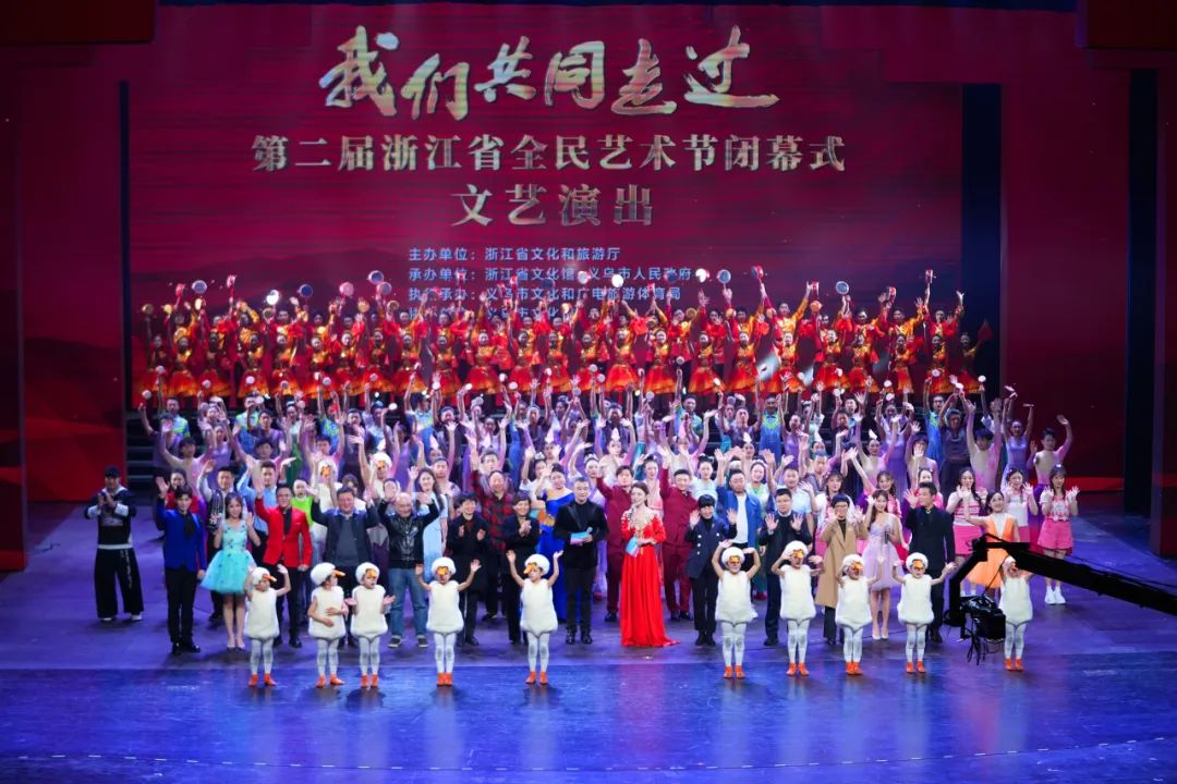万里金风送瑞香,欢歌共舞尽畅扬。11月17日,“我们共同走过”第二届浙江省全民艺术节闭幕式文艺演出在义乌市文化广场剧院拉开大幕。当晚,剧场内群星荟萃,观众爆棚;剧场外灯火通明,星光璀璨。本次活动由浙江省文化和旅游厅主办,浙江省文化馆、义乌市人民政府承办,义乌市文化和广电旅游体育局执行承办,义乌市文化馆协办。