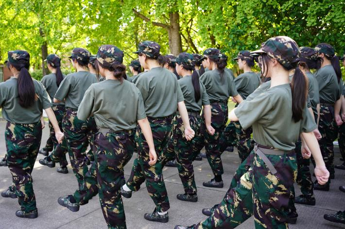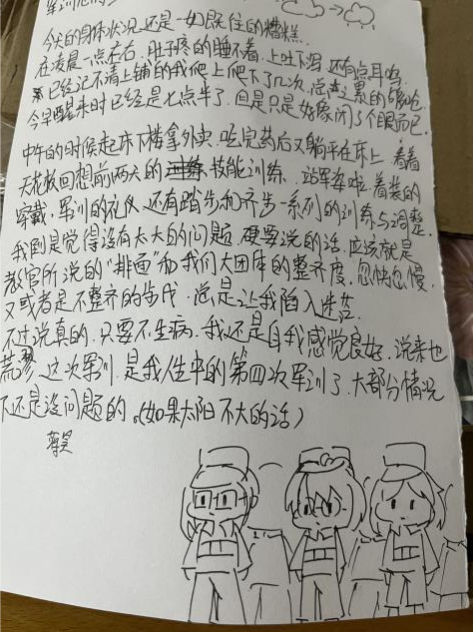 今天很特殊,教官的脸上更加的严肃,比昨天更加的严格.早上的太阳甚是毒辣,眼睛睁不开的倦意让我多了一份怨气。炽热的太阳晒在皮肤上有干干痛痛的感觉.有些感觉无法言传,但同学间的相互一笑,却多了一份鼓励的力量。站军姿时,前脚掌和后脚跟的酸涨让我左右摇摆,但没有教官的命令, 我们没有一个敢动,胳膊很酸,不自觉地颤抖, 却依旧服从命令,每一次和同学并肩而行,每一次和同学们军姿较量都让我们心中的距离拉得更近。