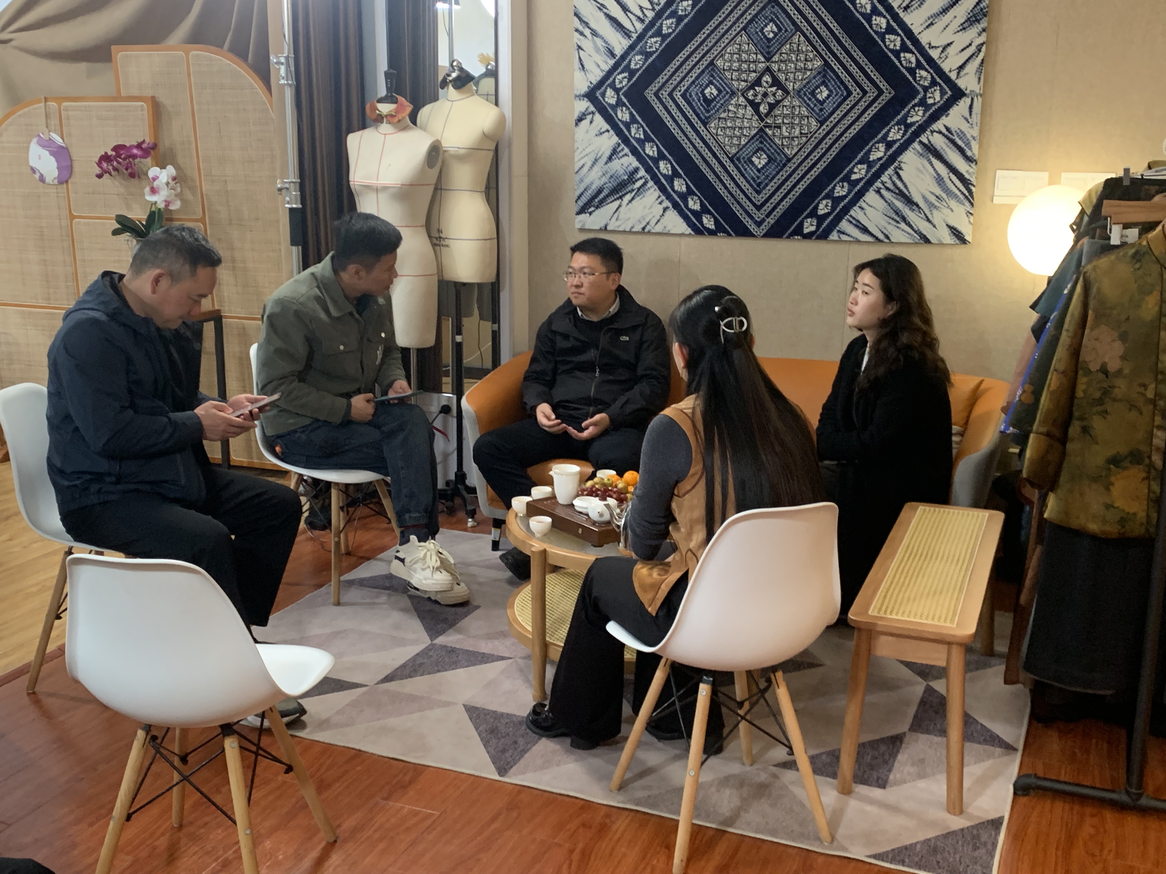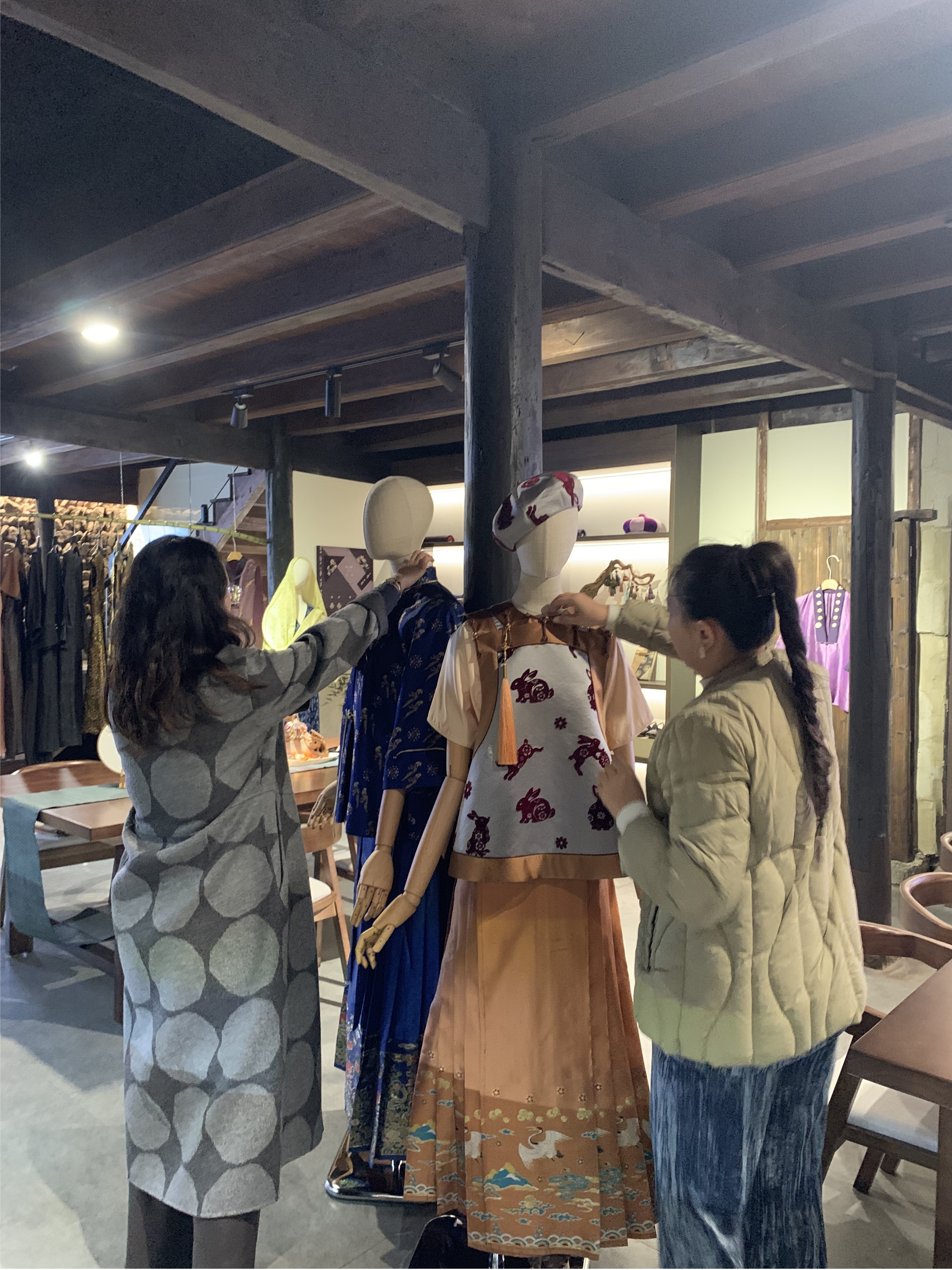 工作室与磐安安文镇镇长多次互相访问,洽谈合作意向并商讨自在云裳香云纱非遗馆建设实施方案,针对非遗馆的各功能模块需求,设计服装、服饰品、工艺品等各类所需展品。