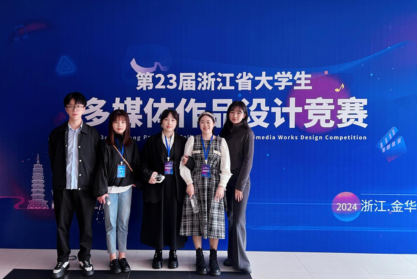 2024年浙江省大学生多媒体竞赛高职动态海报赛项相较往年增加了一定的难度,往年以静态海报为主,今年开始首次以动态海报作为竞赛主要内容和方向。影视美术学院参赛指导教师暑期开始筹备并积极与学生建立沟通,共投递10组动态海报系列作品,经过初审评审后于9月下旬公示了赛事答辩名单。影视美术学院王亚静、陈子龙、曹梦婕老师带领学生于10月25日—26日参加浙江省大学生多媒体竞赛决赛答辩,经过现场答辩和评委评审,最终由王亚静、陈子龙老师指导的作品动态海报《文创·浙乡有礼》获一等奖、《赴乡游·去浙里》获三等奖;由曹梦婕老师指导的作品动态海报《龙泉·碗溪》获二等奖!相较往年,今年取得的成绩质量和数量均是新的突破!