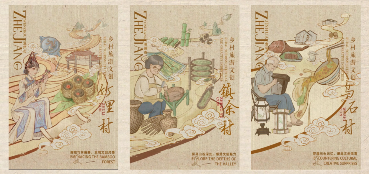 作品说明:海报分别选取了丽水大雅畈村,围绕农耕文化特色创作插画作品表现溪畔田园风光;选取苍坡古村的文化特色和底蕴,围绕溪水板路作为画面主体构思;选取东沙渔村以渔民渔村捕鱼的滨海渔舟景象作为画面创作思路。表现了浙江村落魅力文化底蕴和特色。
