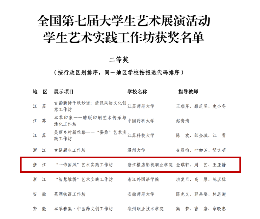 6月11日,中华人民共和国教育部官方网站公布全国第七届大学生艺术展演活动各项目评选结果,我校影视美术学院金琪轩、周艺、王亚静老师指导的《“一饰国风”艺术实践工作坊》大学生艺术实践工作坊斩获全国二等奖。这是我校连续两届入围全国大学生艺术节展演活动,并在此活动中连续两届获得等级奖项。