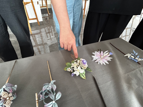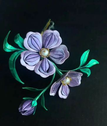 缠花发簪、缠花挂件、缠花胸针等系列作品,同样出自《服饰品设计》课程。学生以丝线、铜丝为材料,经过精心缠绕,形成各种花卉、植物和动物,进一步完善为成品,让缠花美观性与实用性兼具。缠花艺术不仅体现了匠人的高超技艺、还蕴涵着深厚的文化内涵和审美价值。