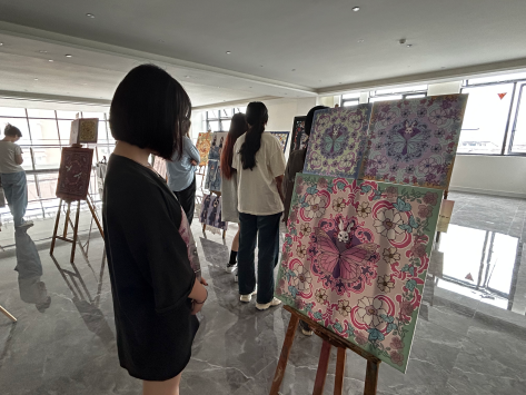 璀璨夏花,盛景六月。影视美术学院服装与服饰设计专业在西门实训楼五楼举办了以“美成在久”为主题作品展。本次展览汇集了服装与服饰设计专业学生的《图案设计》、《电脑绘图技法》、《服饰品设计》等多门专业课程的作品。丝巾图案、缠花发簪、绒花提灯、珠绣香囊等每一件作品都是学生精心之作,从这些学品中,能够深切的感受到学生对传统文化的热爱以及对艺术的独特见解。