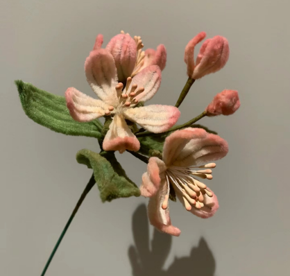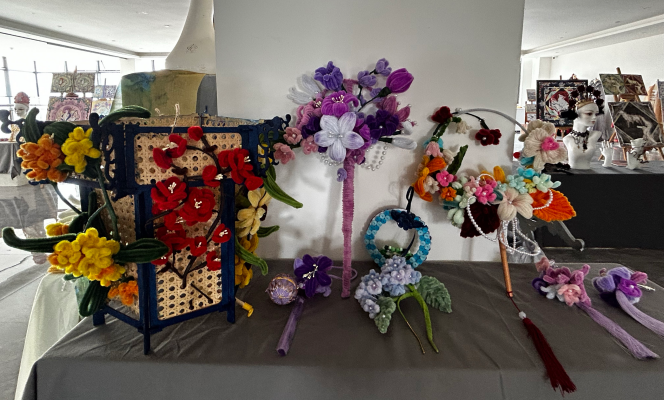 绒花提灯、绒花花束、绒花团扇、绒花发簪等系列作品,均出自《服饰品设计》课程。学生以绒花质感相似的扭扭棒作为绒花制作的材料,经过精细的裁剪和手工缝制,制成形态各异、色彩鲜艳丰富,质感细腻柔软的花朵。绒花作为一种它不仅仅只是一种装饰品,更是文化的传承和艺术的表达。