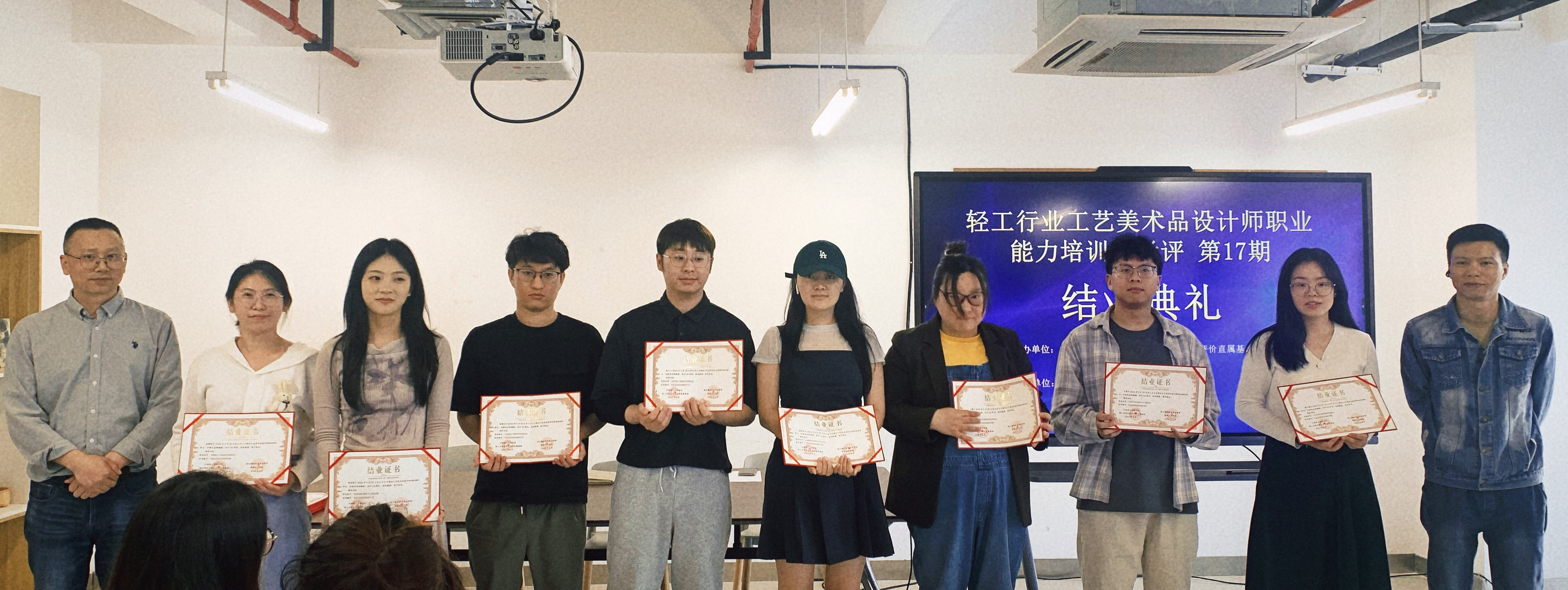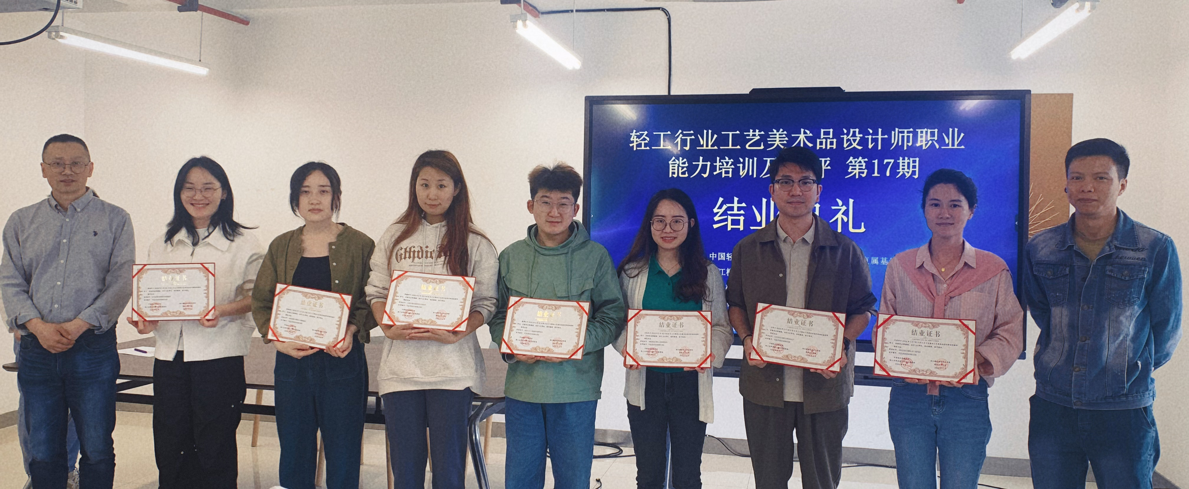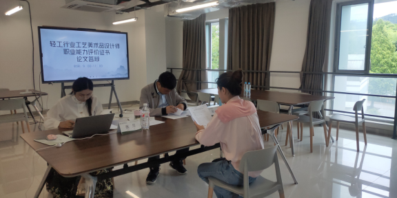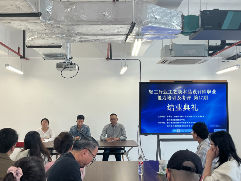 培训的最后,经过紧张的论文答辩环节和理论考试部分,举行了闭幕式和结业证书颁发仪式,参与者均获得由轻工业联合会颁发的职业能力评价证书级结业证书,增强了行业影响力。结业仪式上,影视美术学院院长助理兼实训中心主任董华倡以及教研室主任金琪轩分别发表了讲话,对学员们的努力和成就表示认可,并鼓励他们将所学知识应用到实际工作中去,不断推动工艺美术品设计领域的发展。
