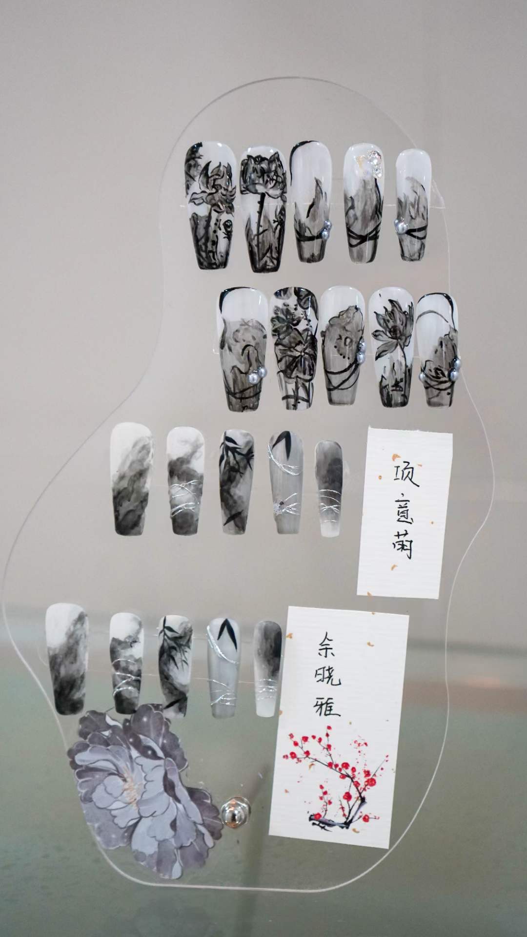 风雨孕育得飞扬,神笔创造辉煌。本次美甲展作品由人物形象设计专业大一、大二学生根据主题构想创作,在展览现场也受到了看展师生的一致好评。展览美甲作品涉及的题材丰富、形式多样、风格鲜明,有静物主题、花鸟主题等,包罗万象。同学们通过绘制各式图案,贴花以及其他的创意构思,打造优雅动人的指间艺术品。