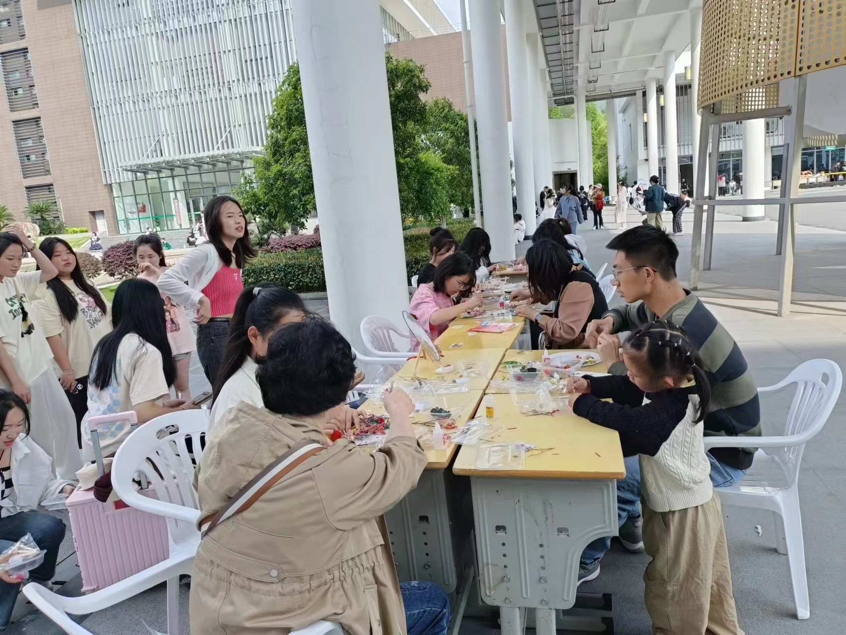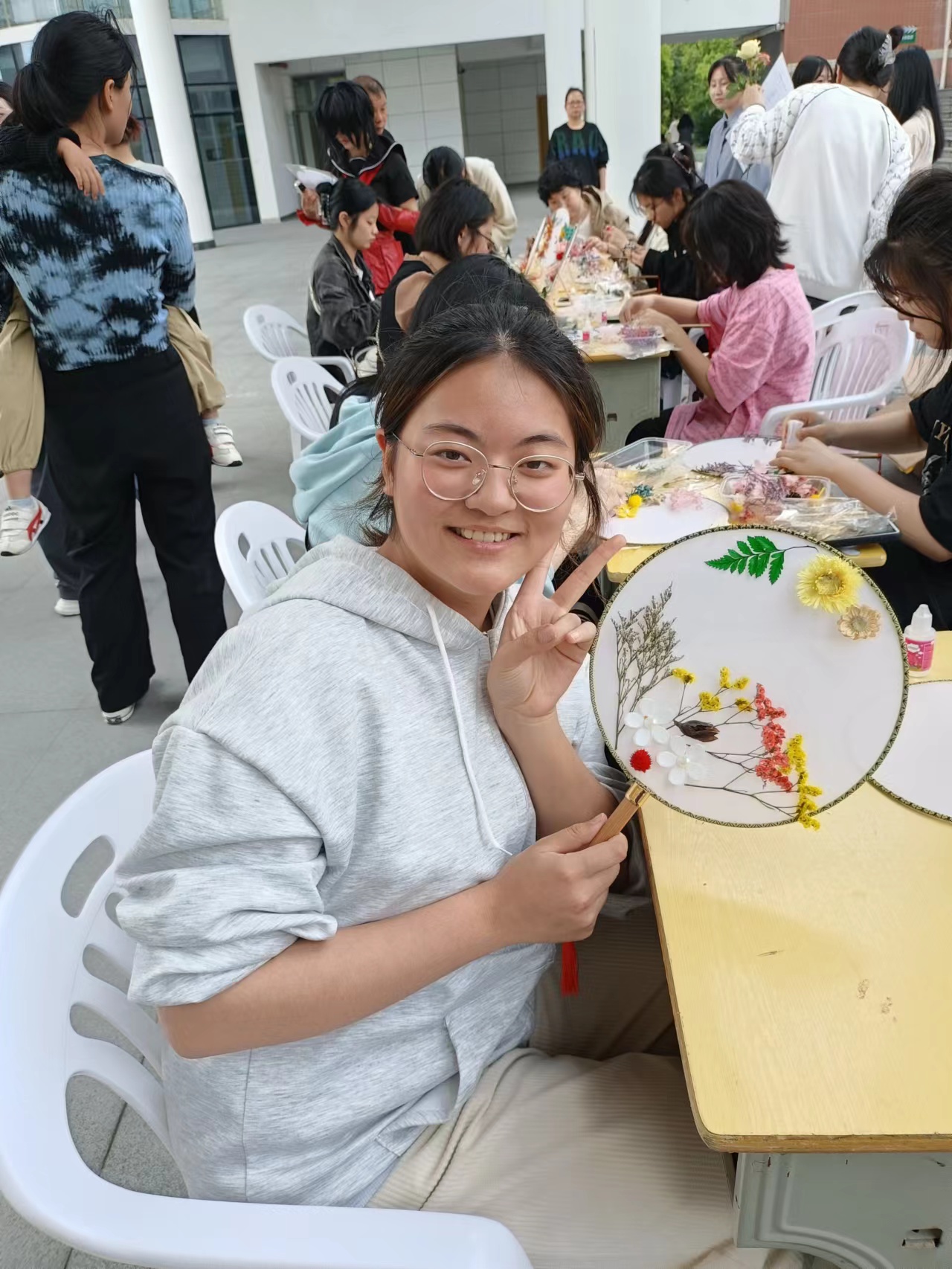 手工社同学在活动现场指导来校考试的同学和家长参与活动,有条不紊的进行创作,气氛十分活跃。本次DIY团扇活动,不仅让考生和家长体会手工的乐趣,还能拥有一把属于自己的满载千年的中国风雅团扇,体会到横影学子的热情,敬请期待下次相遇。