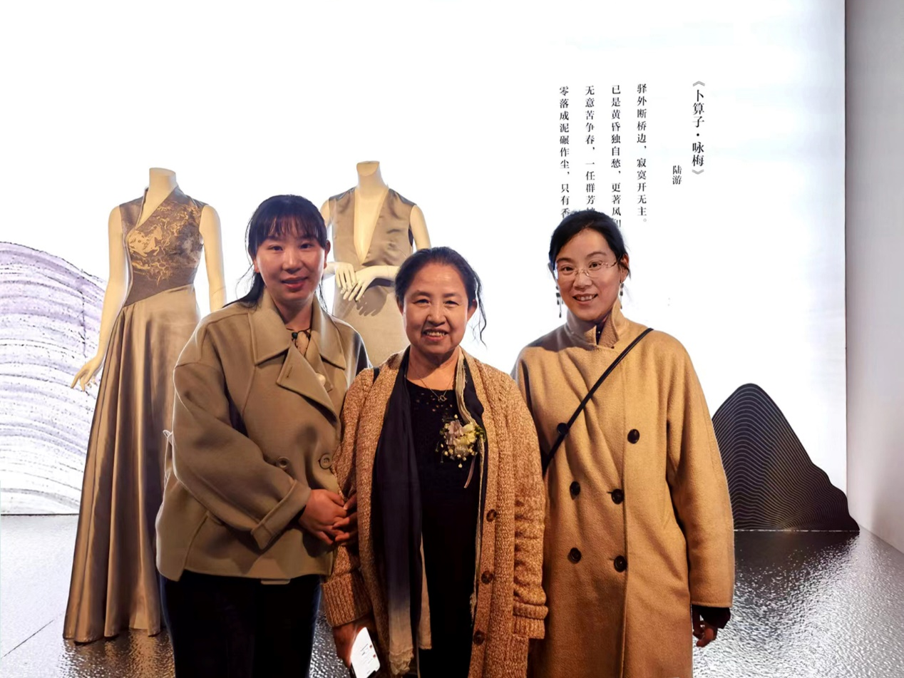 本次展览中,清华大学博士生导师李薇教授的作品在设计创作过程中,我校我专业教师赵月全程参与辅助,并完成了平面着装效果图、面料组织结构图等绘制工作,对3D数字化展示、面料复原、成衣作品最终效果呈现起到重要作用。观展过程中,我们有机会现场聆听李薇教授对个人作品创作故事的讲述,并深入探讨交流了关于宋锦、云锦、吴罗等传统服饰面料织造技艺的现代活化设计应用方法,李薇老师的艺术观点使我们受益匪浅。