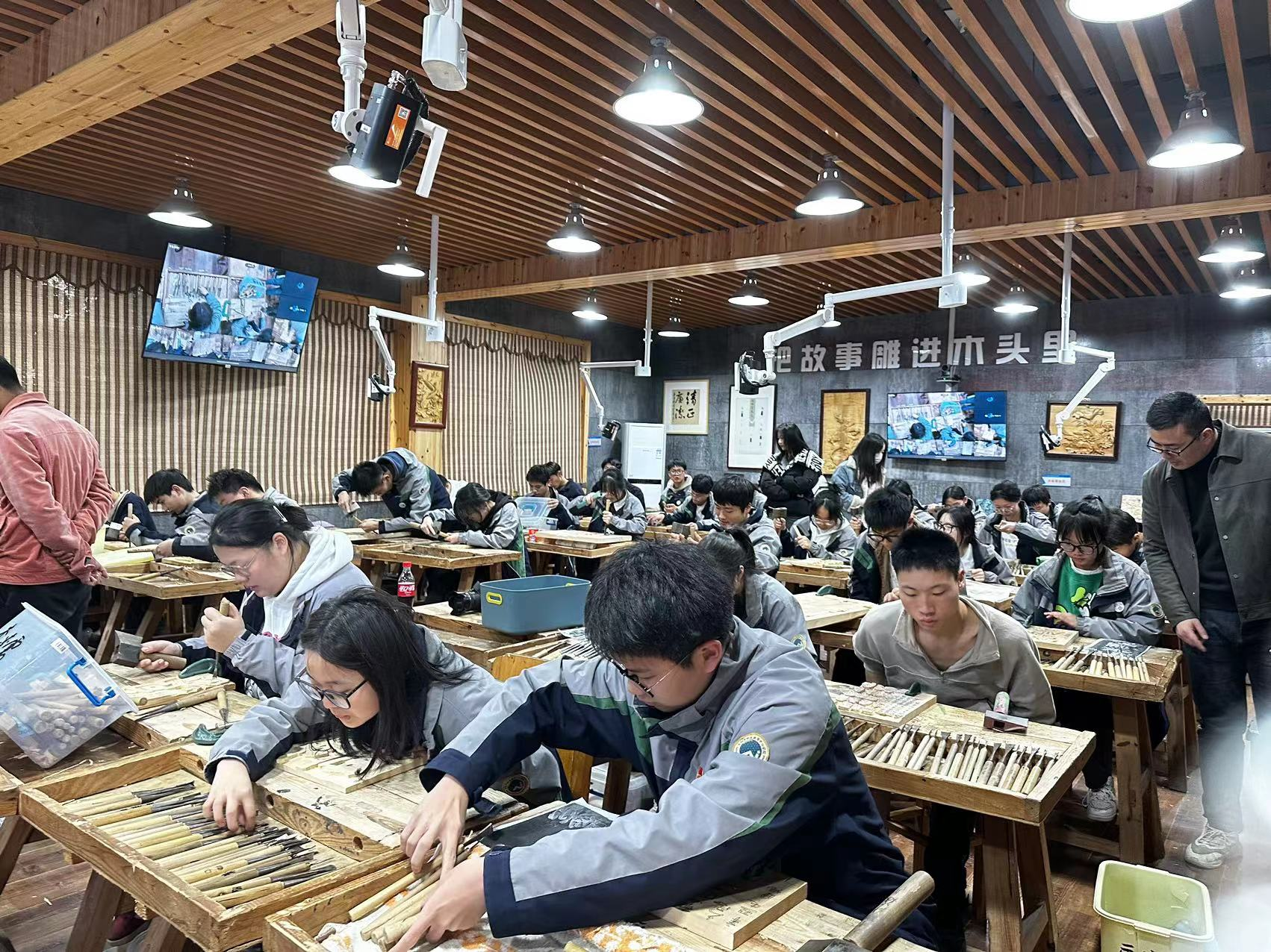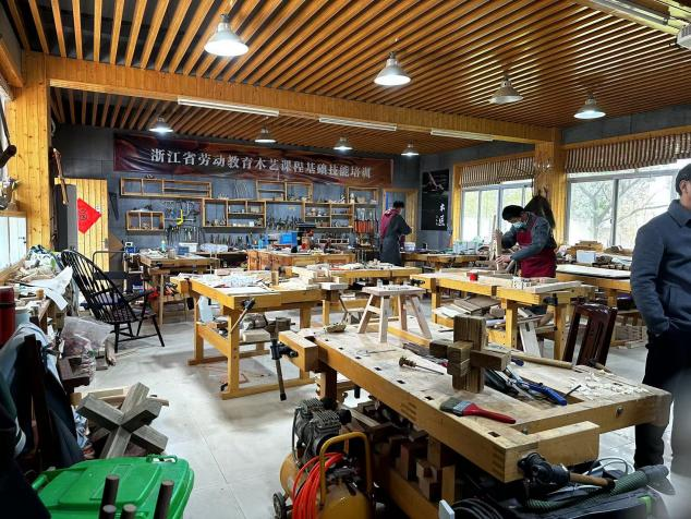 东阳市职业中等专业学校陈副校长、以及艺术专业负责人徐主任、陶老师等人热情接待了本次前往参观交流的教师。首先带领艺术设计和舞美专业教师们参观了校园环境、非遗实训基地、教学实训室基地、作品展厅等场所。详细介绍了校园环境内部建筑、建设规划与景观设施等,以及师生共同设计施工完成的教学成果。其次,东阳市职业中等专业学校相关负责人带领老师们参观了非遗实训基地,详细介绍了各个非遗实训室的针对项目,如无骨花灯、东阳木雕、锡艺等,各位老师表示非遗实训室的建设十分具有针对性、趣味性。而后共同参观了校内展厅、实训室建设,逐一参观了家具木作专业实训室,观看了在校学生上课课堂情况,随行参观教师均表示实训室的建设十分专业,教学目的性很强,实训环境学习氛围浓厚。