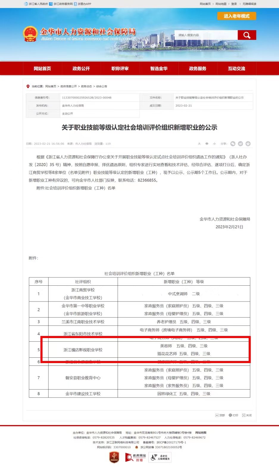 近日,金华市人力资源和社会保障局发布《关于职业技能等级认定社会培训评价组织新增职业的公示》,确定我校增设美容师、花艺师职业(工种),可开展相关职业技能等级认定工作。