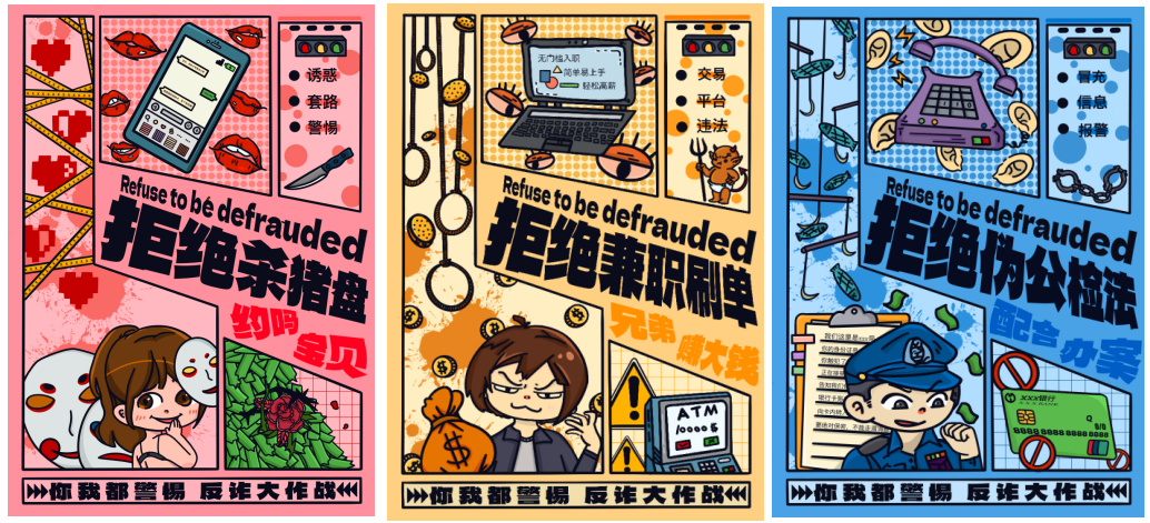 整组海报运用了漫画页的格式,简洁明了的表达诈骗元素,扁平的画风和色调更贴近人们的生活,个性的排版构图也更吸引人,海报分别围绕“杀猪盘”、“兼职刷单”、“伪装公检法”三种诈骗手段为主题,节奏分明,三张海报相互关联,都突出强调了标题的作用。