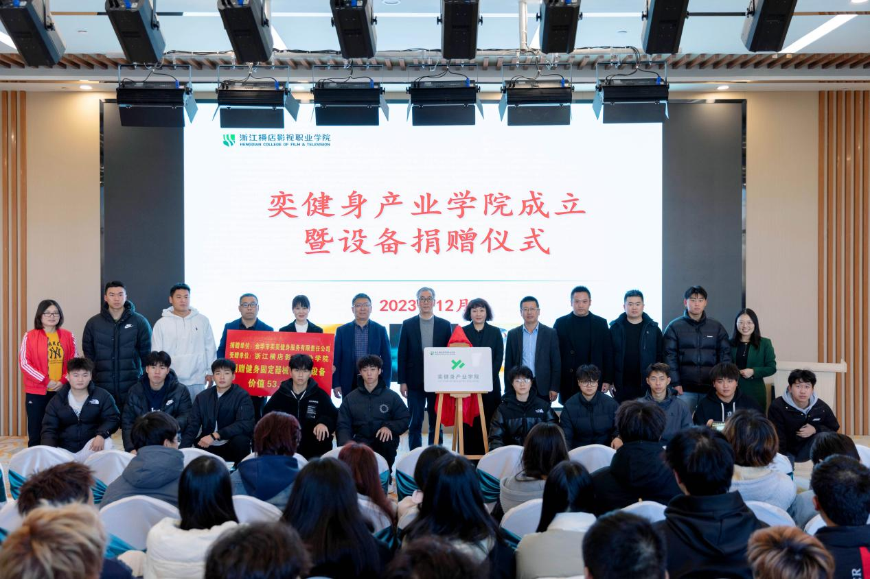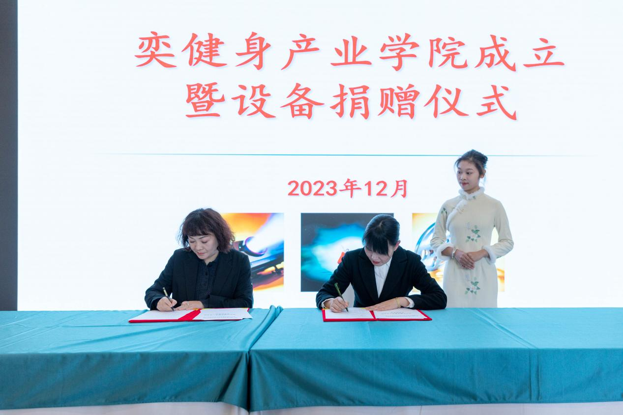 12月8日,学校与金华奕奕健身服务有限公司共建“奕健身产业学院”签约暨揭牌仪式在新实训大楼宴会厅隆重举行。奕健身董事长丁奕、奕健身总经理江斌出席,学校党委副书记、校长王兆青;校党委副书记、常务副校长安华;校纪委书记施红峰;影视旅游学院党总支书记兼院长陈小芳;组宣合作中心副主任王文虎;影视旅游学院各专业负责人及休闲体育学生代表出席。休闲体育教研室主任薛朝主持签约仪式。