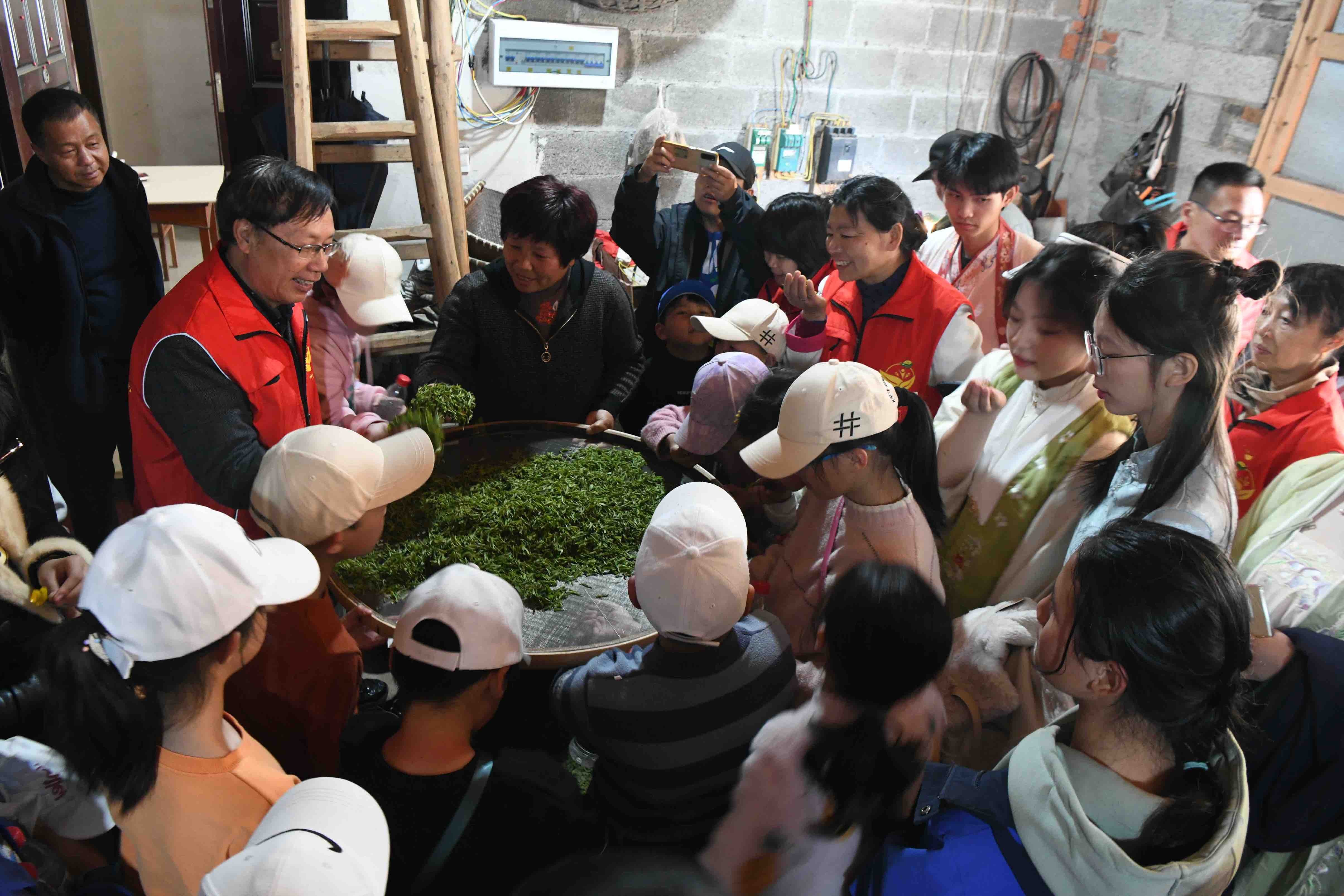 30多名来自东阳市三单乡的留守困境儿童和双休日返乡学生,在该乡团委书记卢翔、乡妇联副主席单巧兰的带领下,来到该乡山背村,在当地茶农与浙江横店影视职业学院专业老师的指导下采摘新茶,大家或轻捏,或瞬提,片片嫩芽落入小篓里。