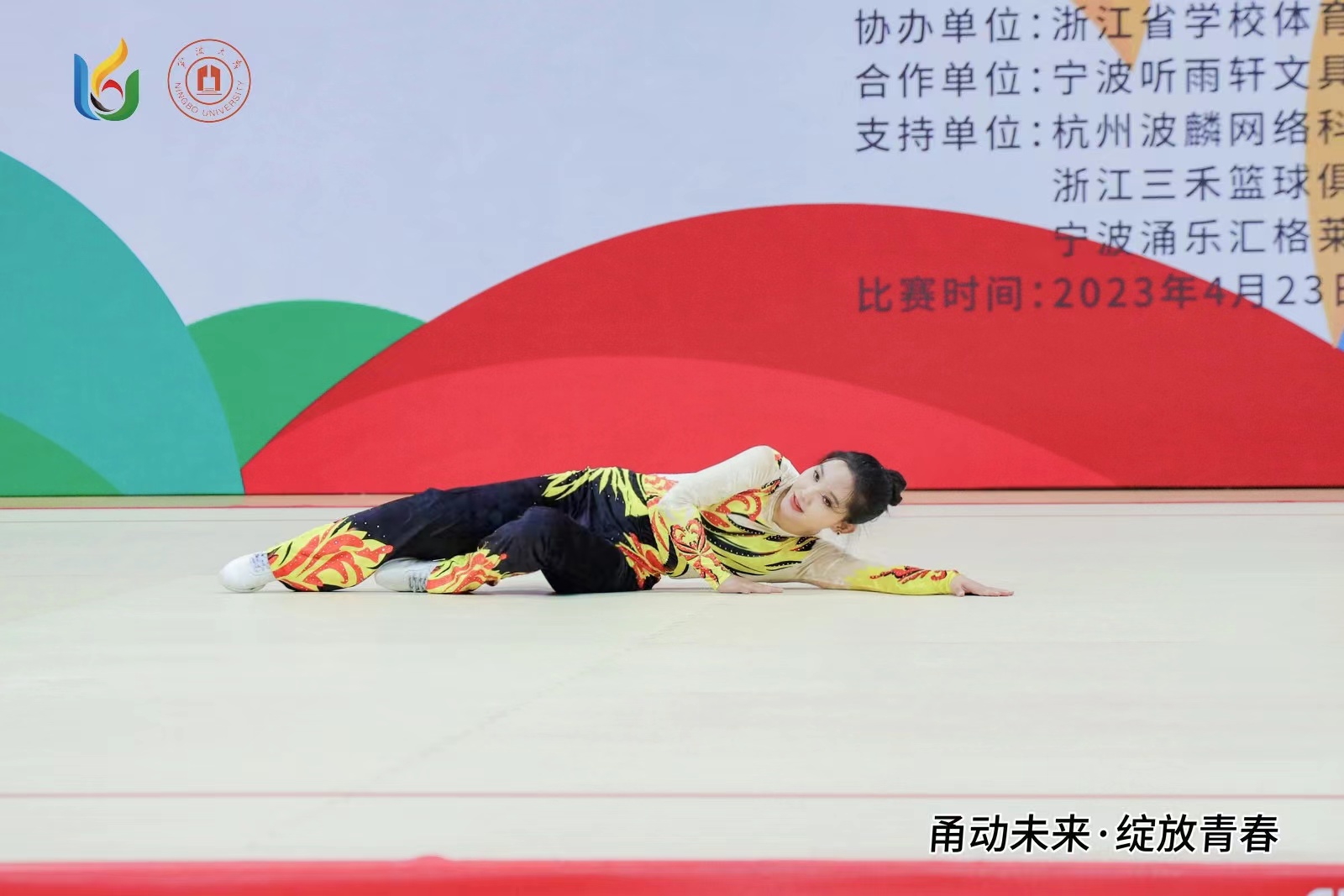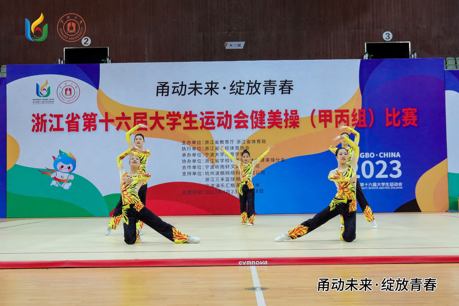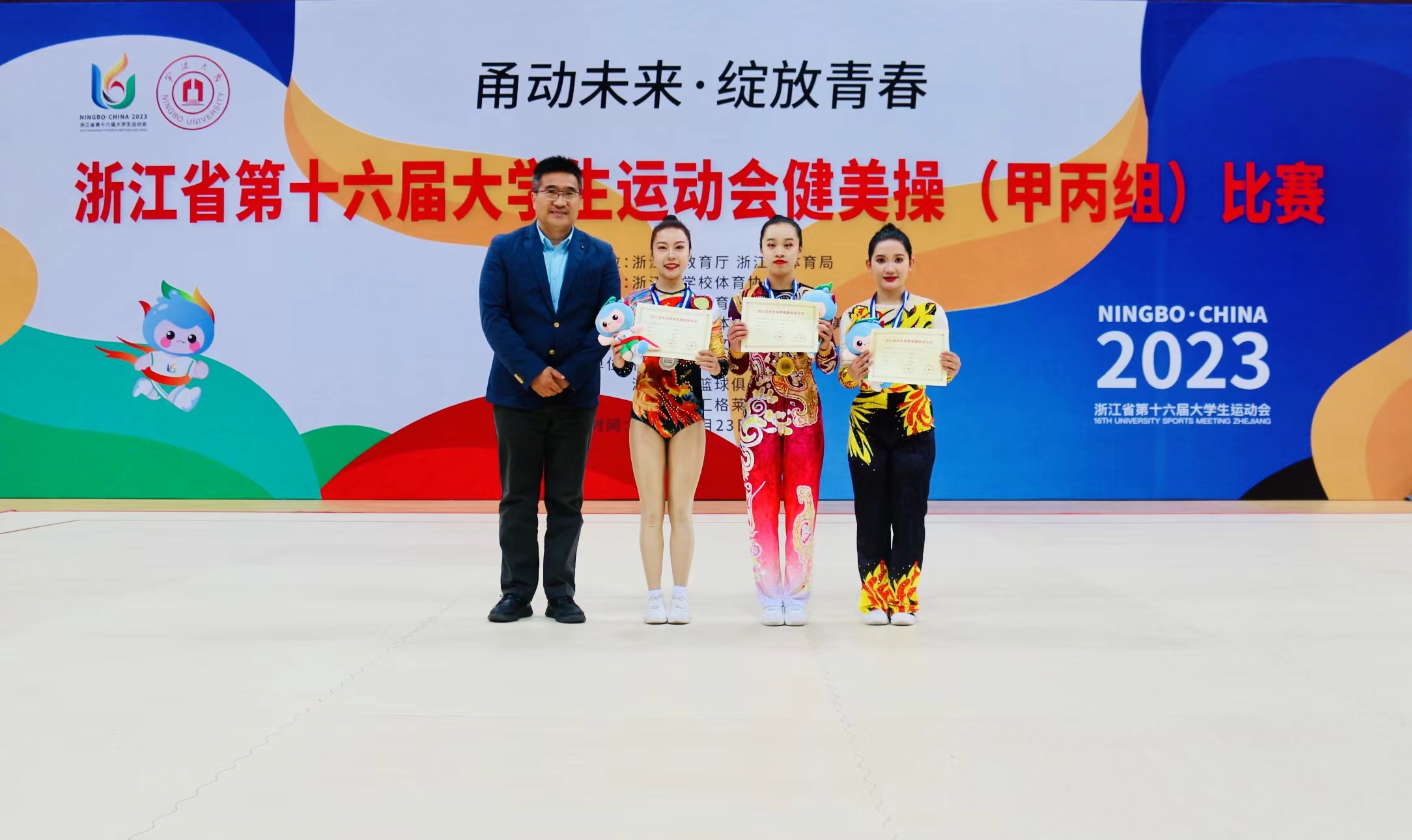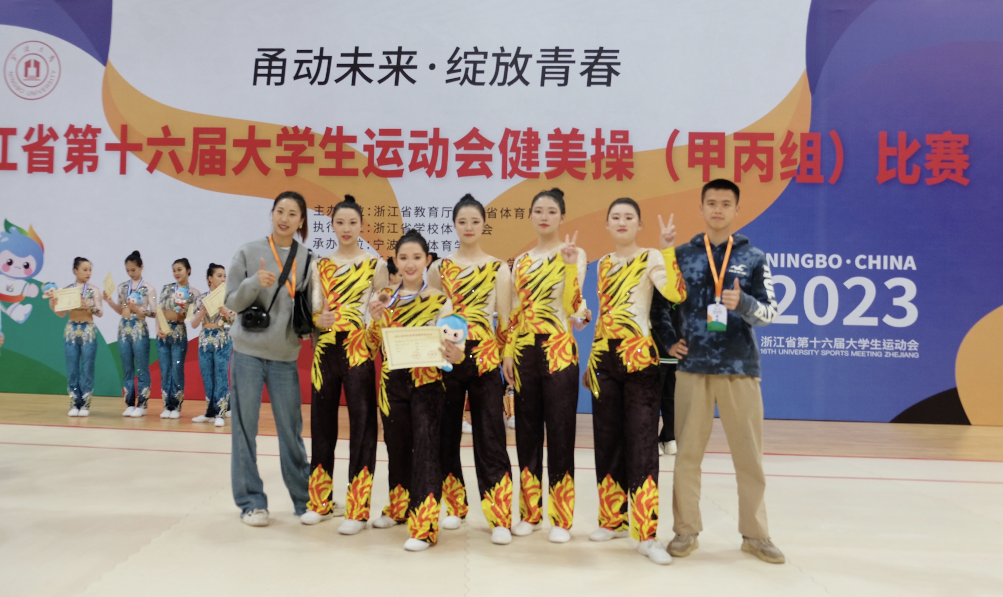 2023年4月23-28日,浙江省第十六届大学生运动会健美操(甲丙组)比赛在宁波大学举行。这是我校休闲体育专业第一次独立组建队伍代表代学校参浙江省大学生运动会健美操(甲丙组)比赛。由宋美娜老师带队,在教练员曹海妃和欧亚龙老师的认真指导下喜获佳绩。在竞技健美操项目丙组中自编女子单人操取得第三名、5人自编有氧舞蹈取得第五名,报名参赛项目均获奖。