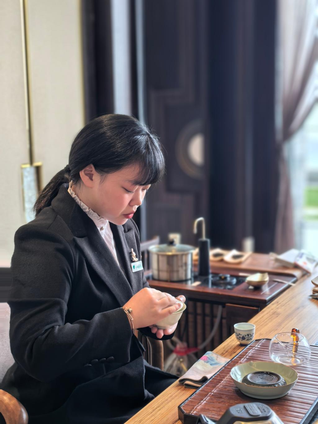 余莹烨,现任湖州城投观湖酒店有限公司销售经理兼茶艺师。凭借出色的业务能力和专业素养,成功统筹接待政府政务会议、企业商务活动、旅行团及婚宴周岁宴等各类宴会活动近百场,并多次为政府领导及高端客户提供高水准的茶艺表演服务,赢得广泛赞誉。