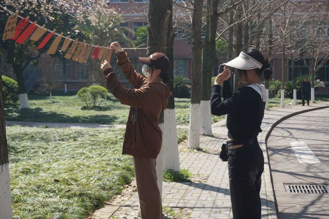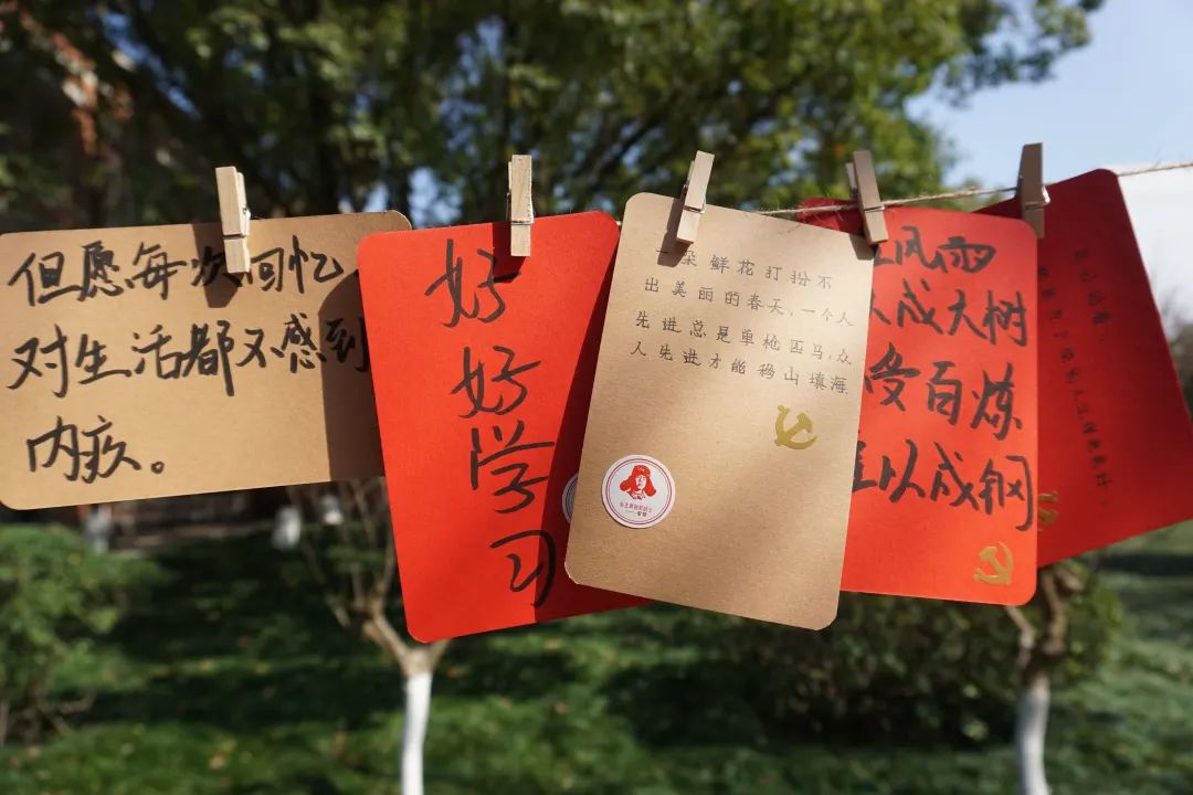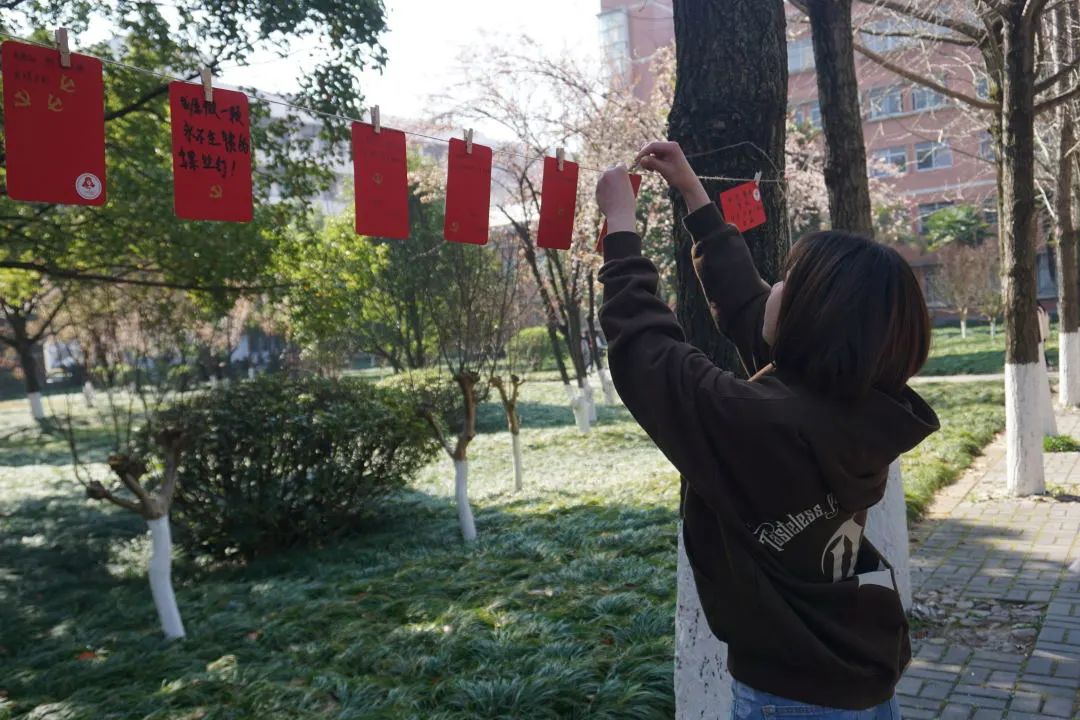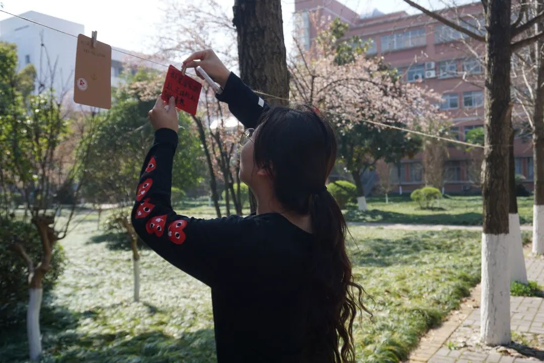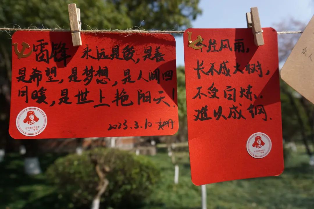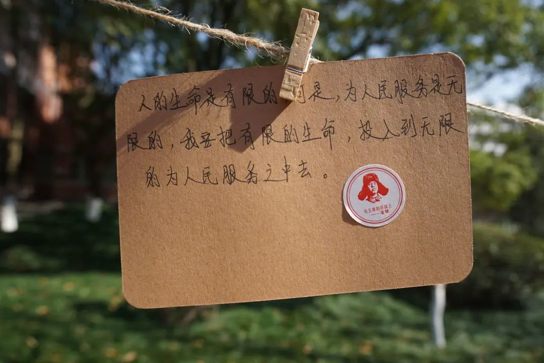 活动过程中,同学们积极参与,一笔一划,怀着崇敬的心情写下关于雷锋同志的金句,郑重地贴上党徽和雷锋贴纸,并将其悬挂于绿荫之中,表达着“向雷锋学习,争做新时代青年”的决心和勇气。在阳光的照耀下,在绿叶的映衬中,原本朴素的卡纸也散发出了熠熠生机!