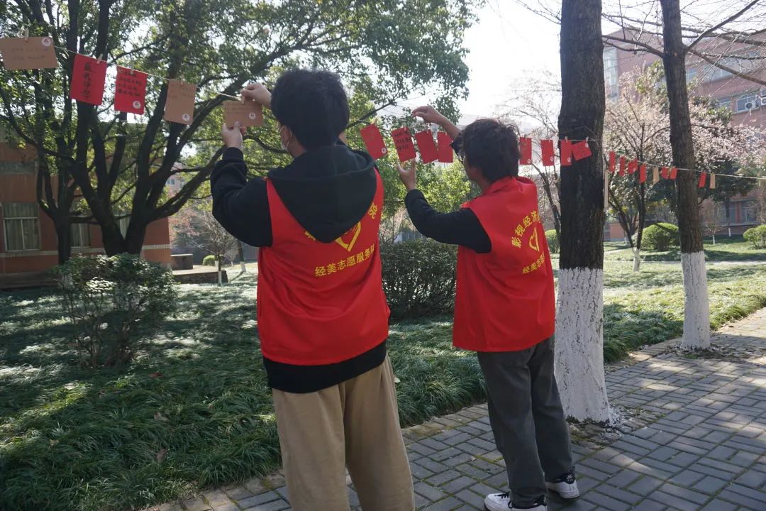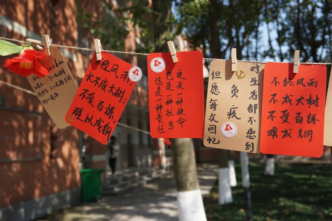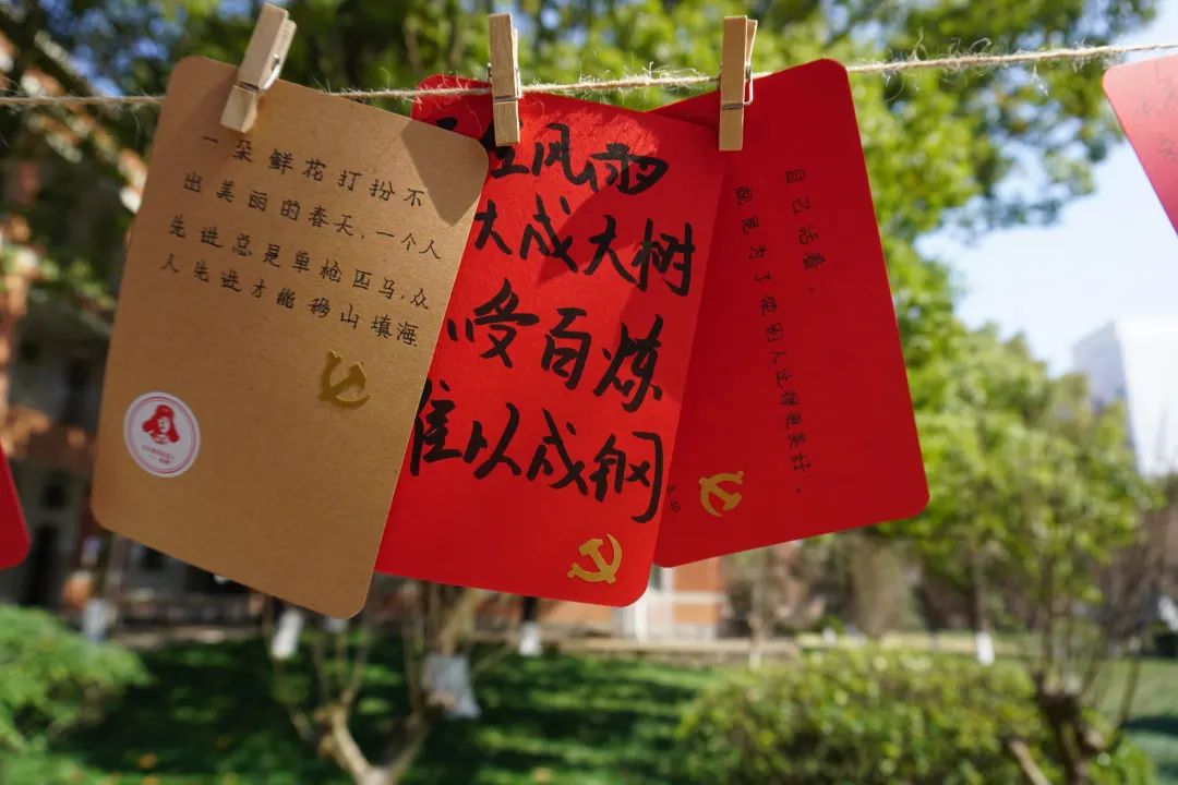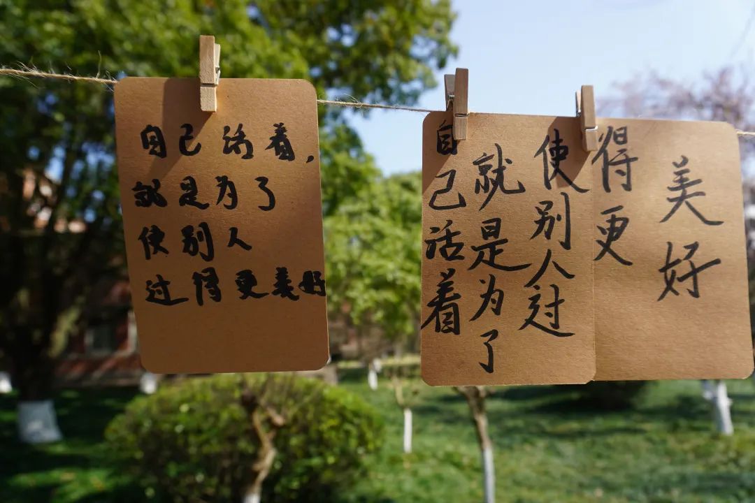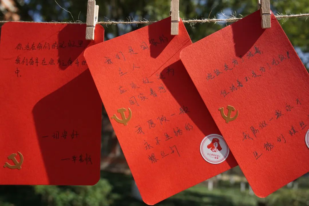 活动过程中,同学们积极参与,一笔一划,怀着崇敬的心情写下关于雷锋同志的金句,郑重地贴上党徽和雷锋贴纸,并将其悬挂于绿荫之中,表达着“向雷锋学习,争做新时代青年”的决心和勇气。在阳光的照耀下,在绿叶的映衬中,原本朴素的卡纸也散发出了熠熠生机!