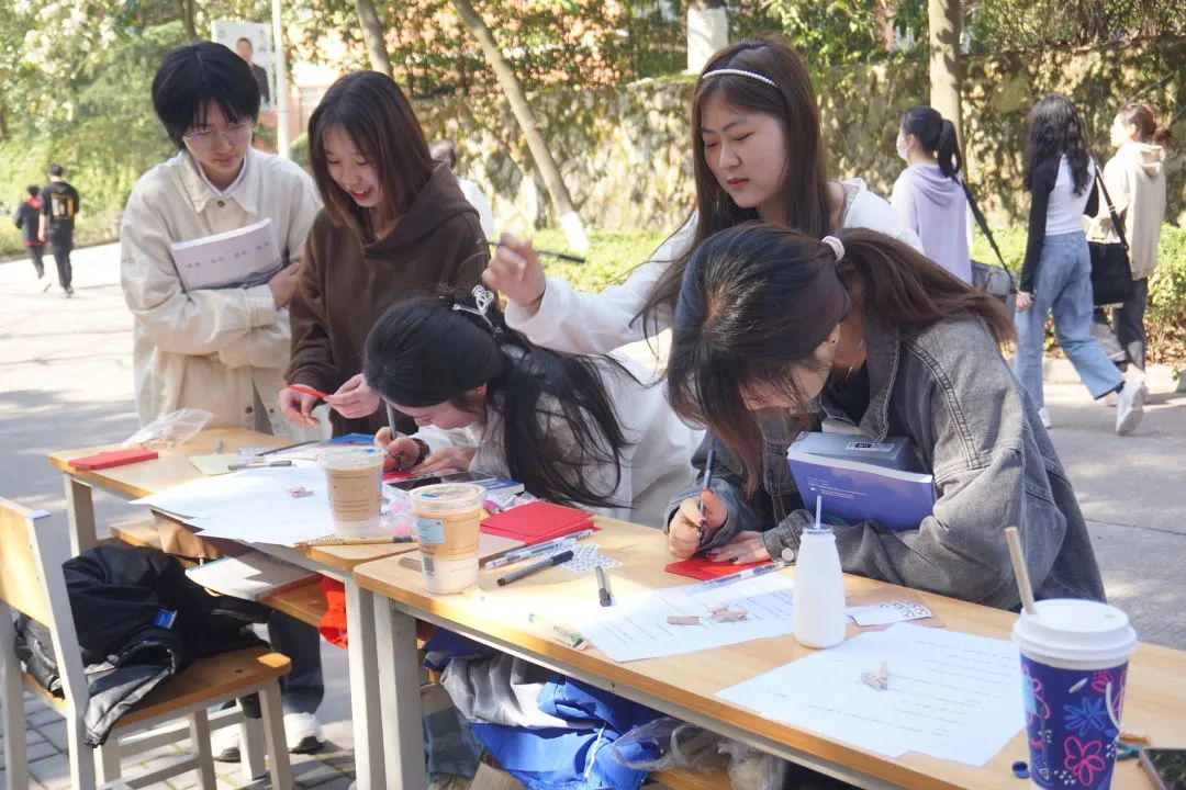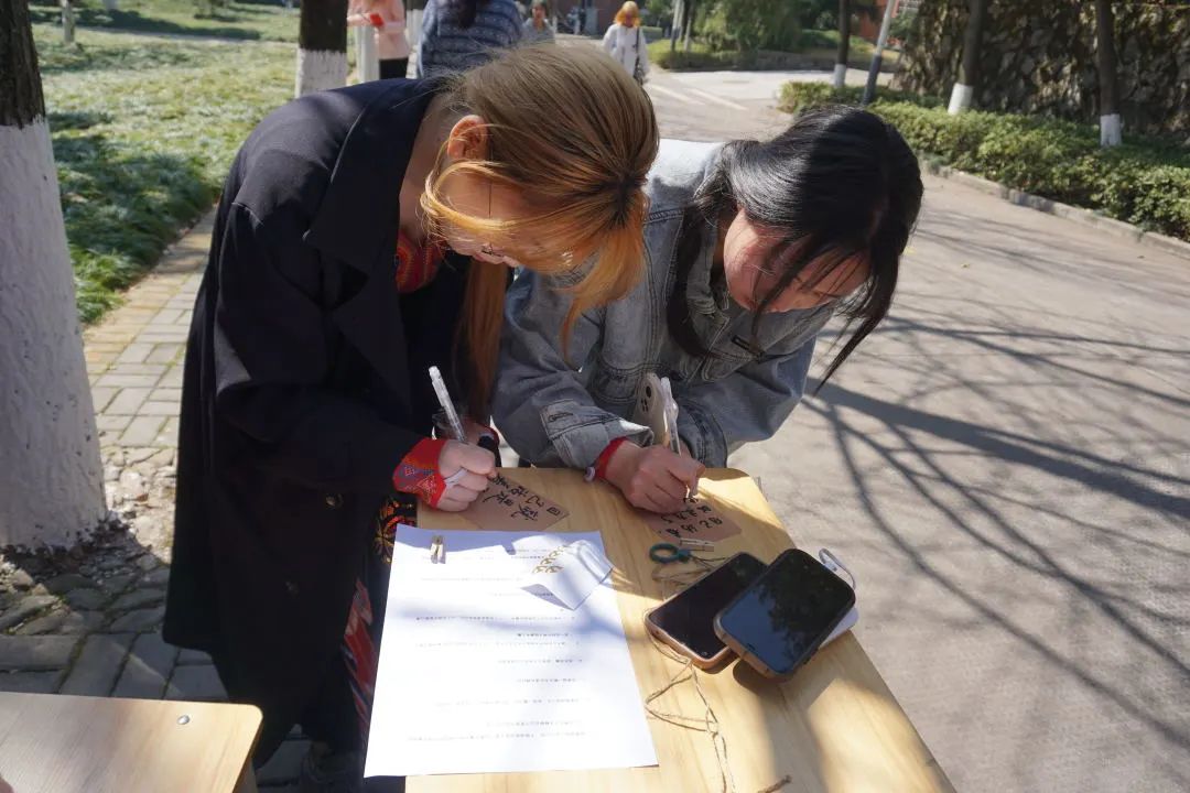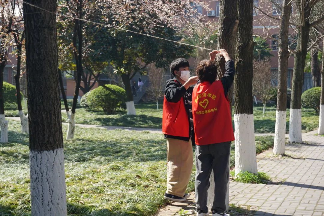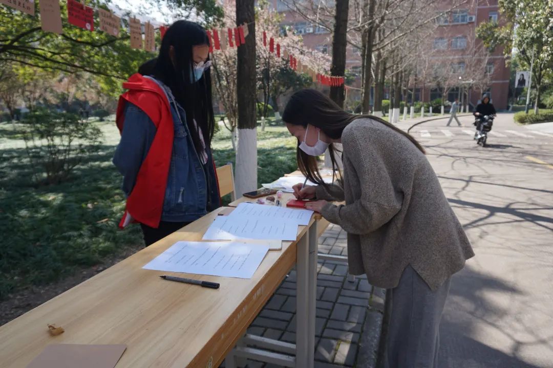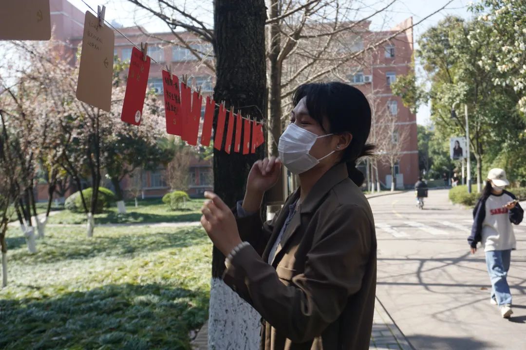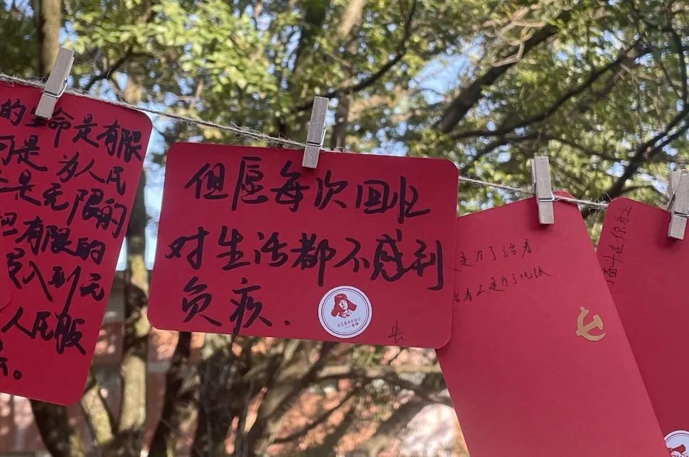活动过程中,同学们积极参与,一笔一划,怀着崇敬的心情写下关于雷锋同志的金句,郑重地贴上党徽和雷锋贴纸,并将其悬挂于绿荫之中,表达着“向雷锋学习,争做新时代青年”的决心和勇气。在阳光的照耀下,在绿叶的映衬中,原本朴素的卡纸也散发出了熠熠生机!