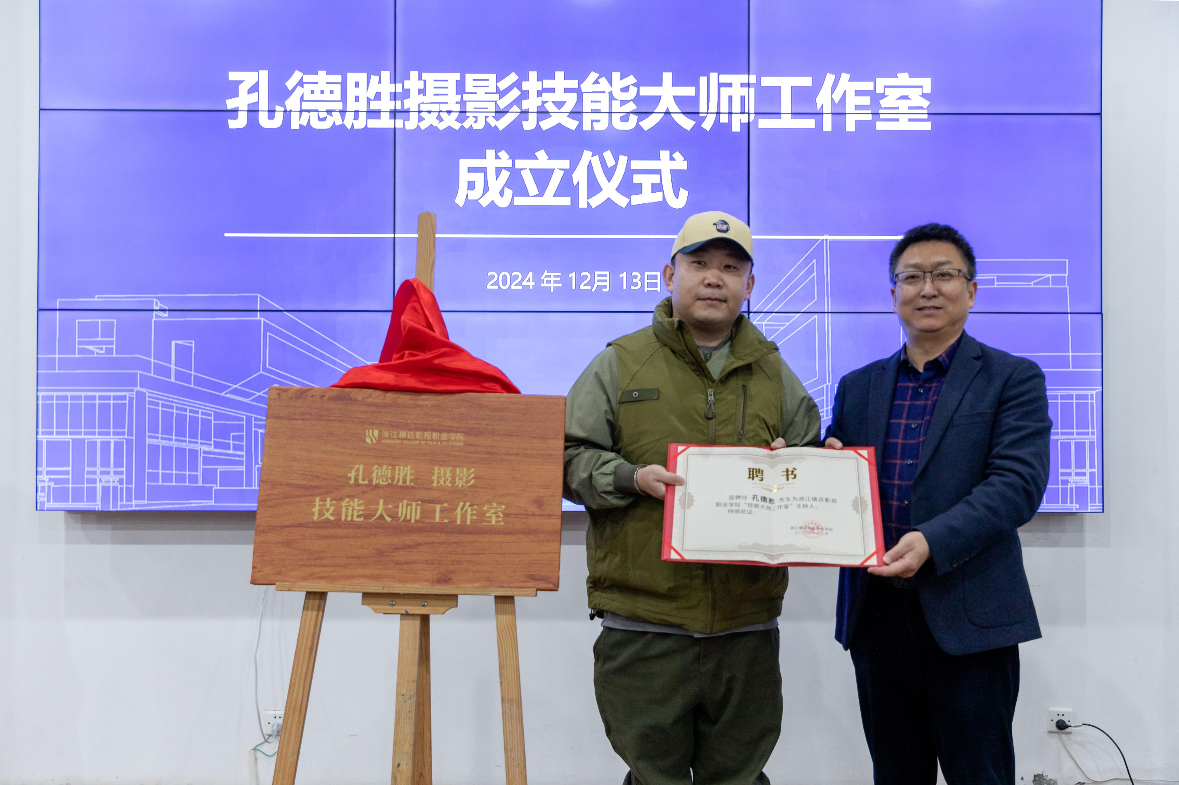 仪式现场举行了工作室揭牌仪式。安华为孔德胜颁发聘书,佩戴校徽。从这一刻起,孔德胜先生正式成为我校的行业导师。孔德胜,业内资深剧照师、剧照行业翘楚,曾在多个知名电影电视剧中担任剧照师工作。作品有《绣春刀》《奇迹笨小孩》《红毯先生》《上阳赋》等。剧照拍摄能力突出,在画面结构、画面节奏、光影拍摄、人物情感捕捉等方面以及影视物料制作工业化方面,具备丰富的实战经验。陈小芳介绍了我校摄影摄像技术专业基本情况。她强调,孔德胜摄影技能大师工作室的成立,将有效促进影视制作专业群的建设与发展,“零距离”对接影视行业。她鼓励在座的青年教师与学生把握这一契机,借助工作室平台优势,锻造一支高技能师资队伍,培养一批拔尖创新人才,提升学校服务影视文化产业的能力和水平。活动现场,孔德胜与在场师生进行了交流,他讲述了剧照行业的发展和个人成长的经历。他鼓励同学们要树立目标理想,有毅力、有恒心,在实践中不断学习与打磨,努力掌握拍摄剧照的核心技术,促进个人职业发展。此次技能大师工作室成立,是学校深入贯彻落实《浙江省深化产教融合推进职业教育高质量发展实施方案》《职业教育产教融合赋能提升行动实施方案(2023—2025年)》等文件精神的重要举措。未来,影视制作专业群将充分利用行业导师的引领示范和指导作用,加强专业内涵建设,提高学校技能人才培养质量,促进影视教育和影视产业的有机衔接。