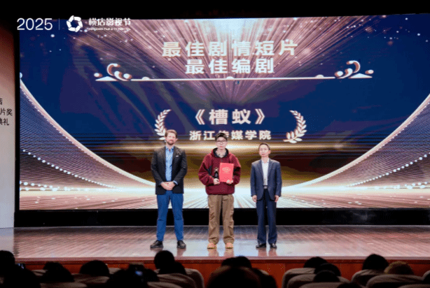 各大奖项逐一揭晓,荣誉与掌声交织。入围奖由暨南大学《影的告别》、武汉设计工程学院《偶遇》等作品获得,一级编剧张险峰与优秀校友、青年演员袁志颖担任颁奖嘉宾。南京艺术学院《彼时此刻》、上海戏剧学院《空心病》等作品斩获优秀奖,影视制作学院院长杨剑与浙江师范大学戏剧与影视学教授、博士生导师李勇强为获奖者颁奖。在单项奖评选中,亮点十足:成都锦城学院《烟火器》与浙江横店影视职业学院《浙里・新生》《绿水青山 未来之城》共享“最佳创意短视频”,影视美术学院院长朱勇与北京锋影传媒有限公司总制片人韩龙颁奖。浙江横店影视职业学院《小钰》摘得 “最佳实验短片”,浙江横店影视职业学院校长助理陈小芳与奔鸟先飞(北京)影视文化有限公司制片统筹张文娟颁奖。大连民族大学《火语》获 “最佳动画短片”,浙江横店影视职业学院纪委书记施红峰与横店影视城国际发展中心总经理郭姝颁奖。青岛电影学院《十米台日记》斩获 “最佳纪录短片”,横店影视文化产业研究院院长施海刚与北京国际电影节星瀚计划负责人李英莉颁奖。“最佳编剧” 奖项则花落浙江传媒学院《槽蚁》,徐铭与上海温哥华电影学院电影制作专业系主任Darren Borrowman为其颁奖。