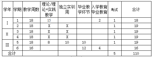 基本学制3年,共6个学期,每学期基本为19周,其中教学18周,考试1周(根据每个学期长短不同,教学周做相应调整);第六学期共16周,其中顶岗实习12周,论文辅导、答辩4周。
