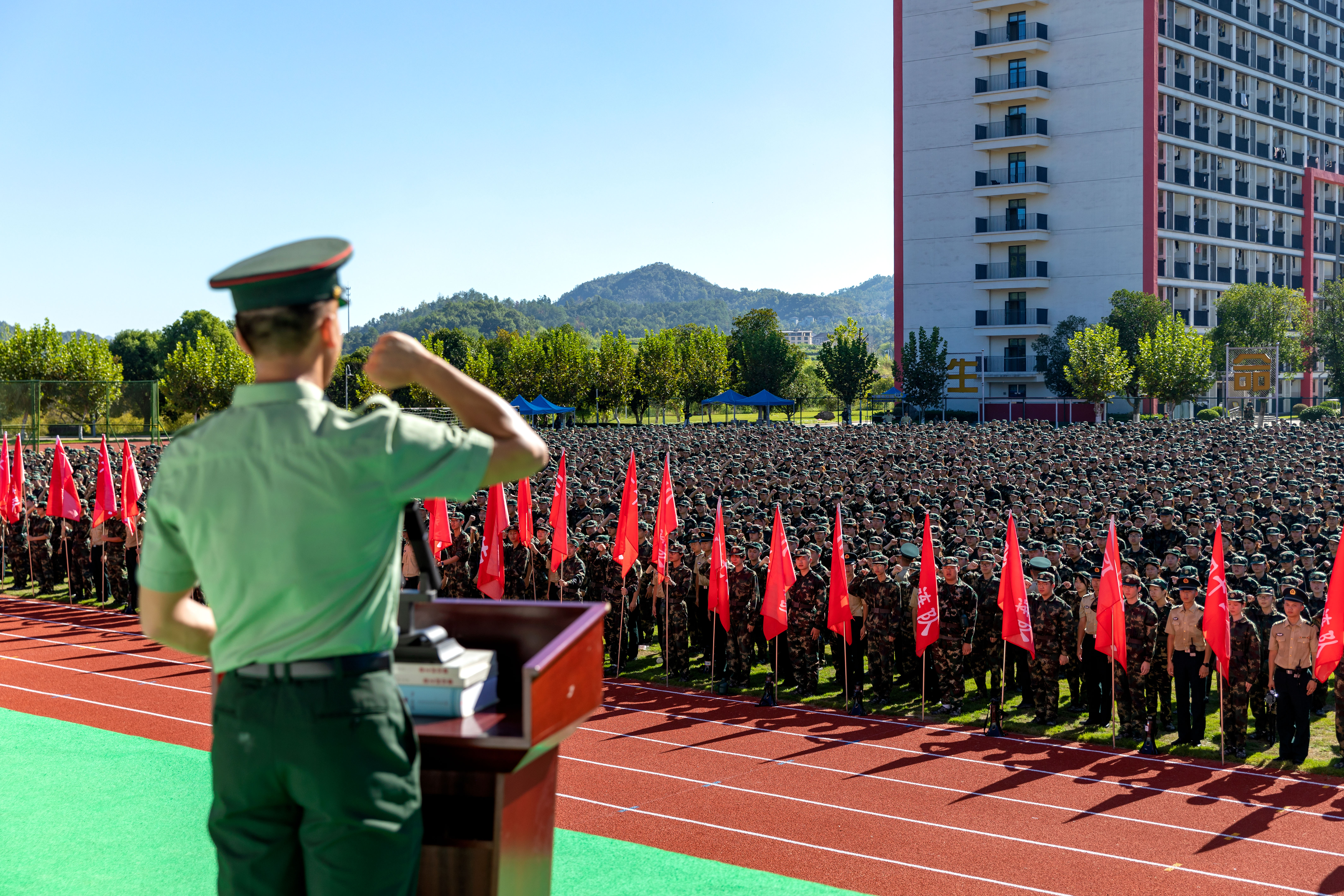 9月16日上午,浙江横店影视职业学院2025级新生开学典礼暨军训动员大会在学校田径场隆重举行,5400余名新生以昂扬姿态开启大学生涯新篇章。承训部队首长,横店集团助理总...